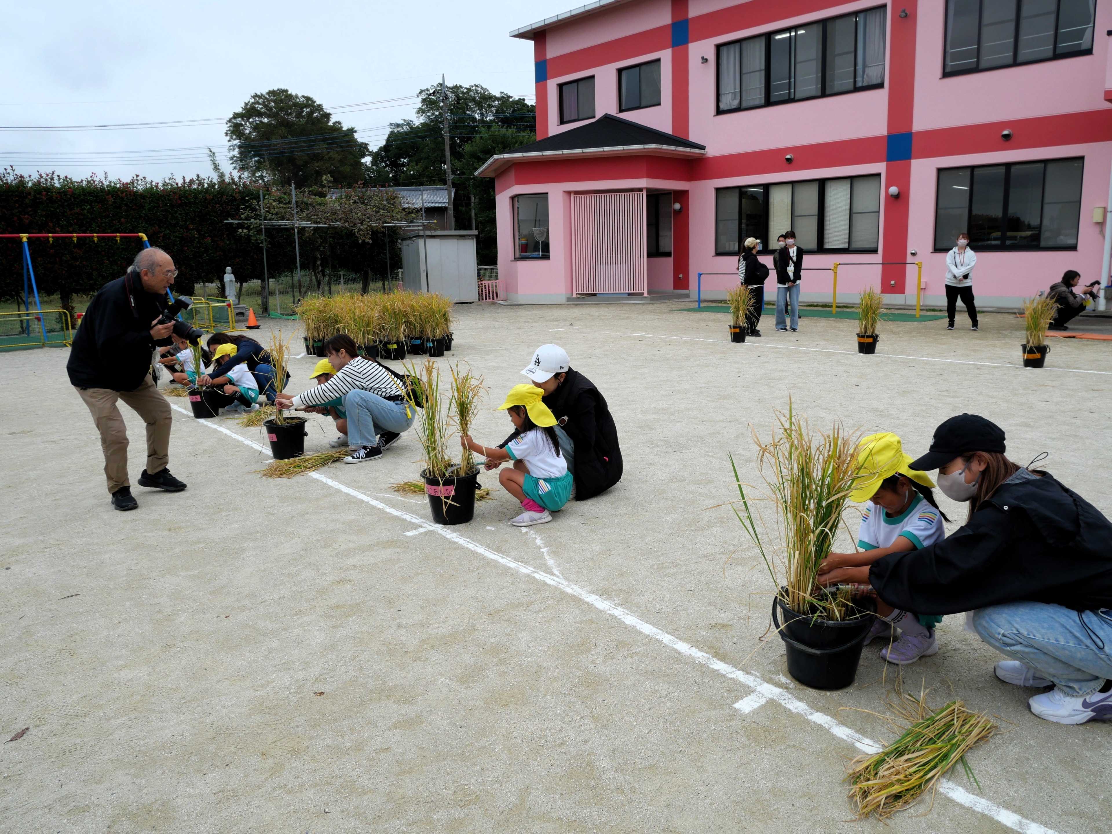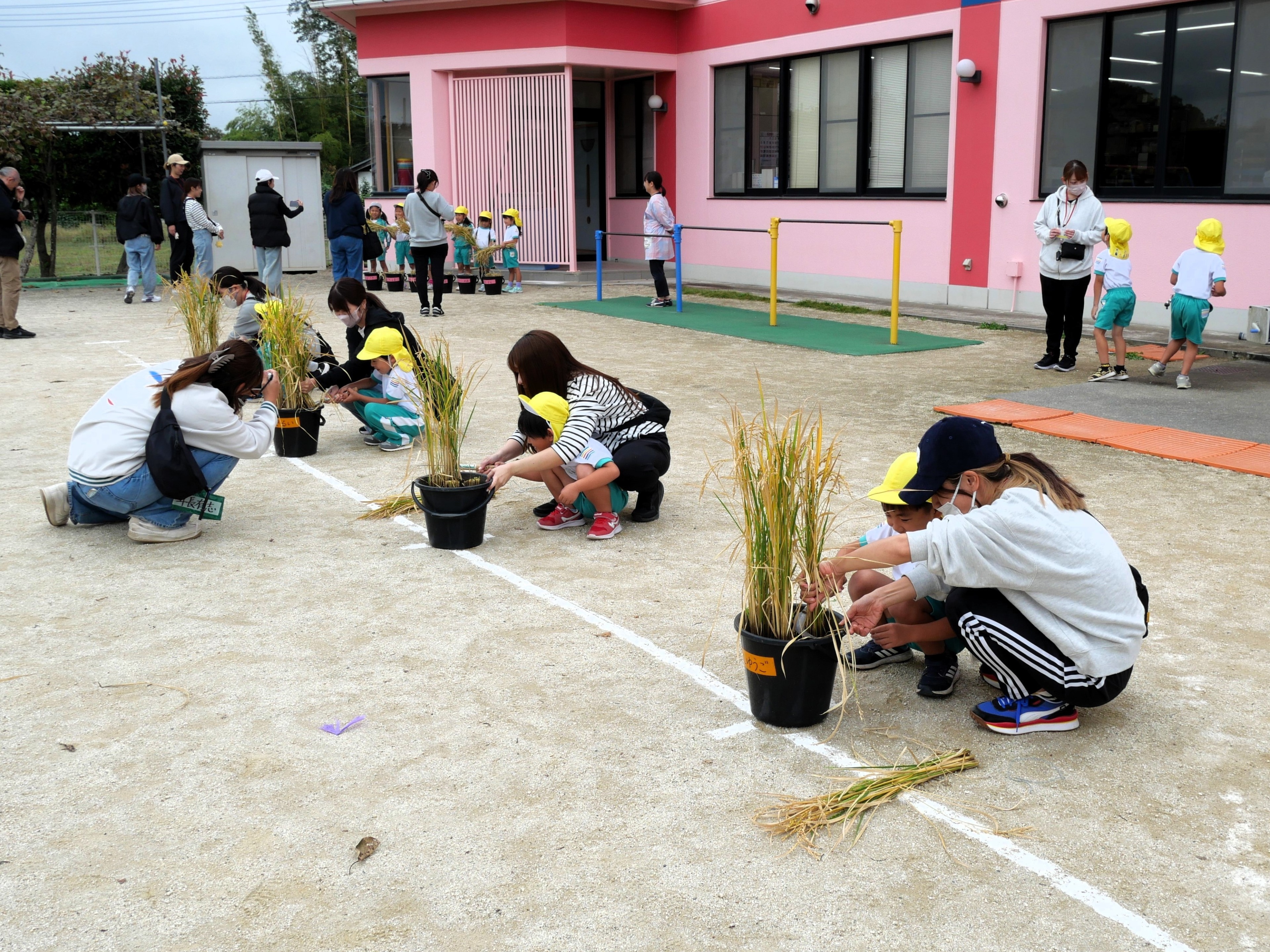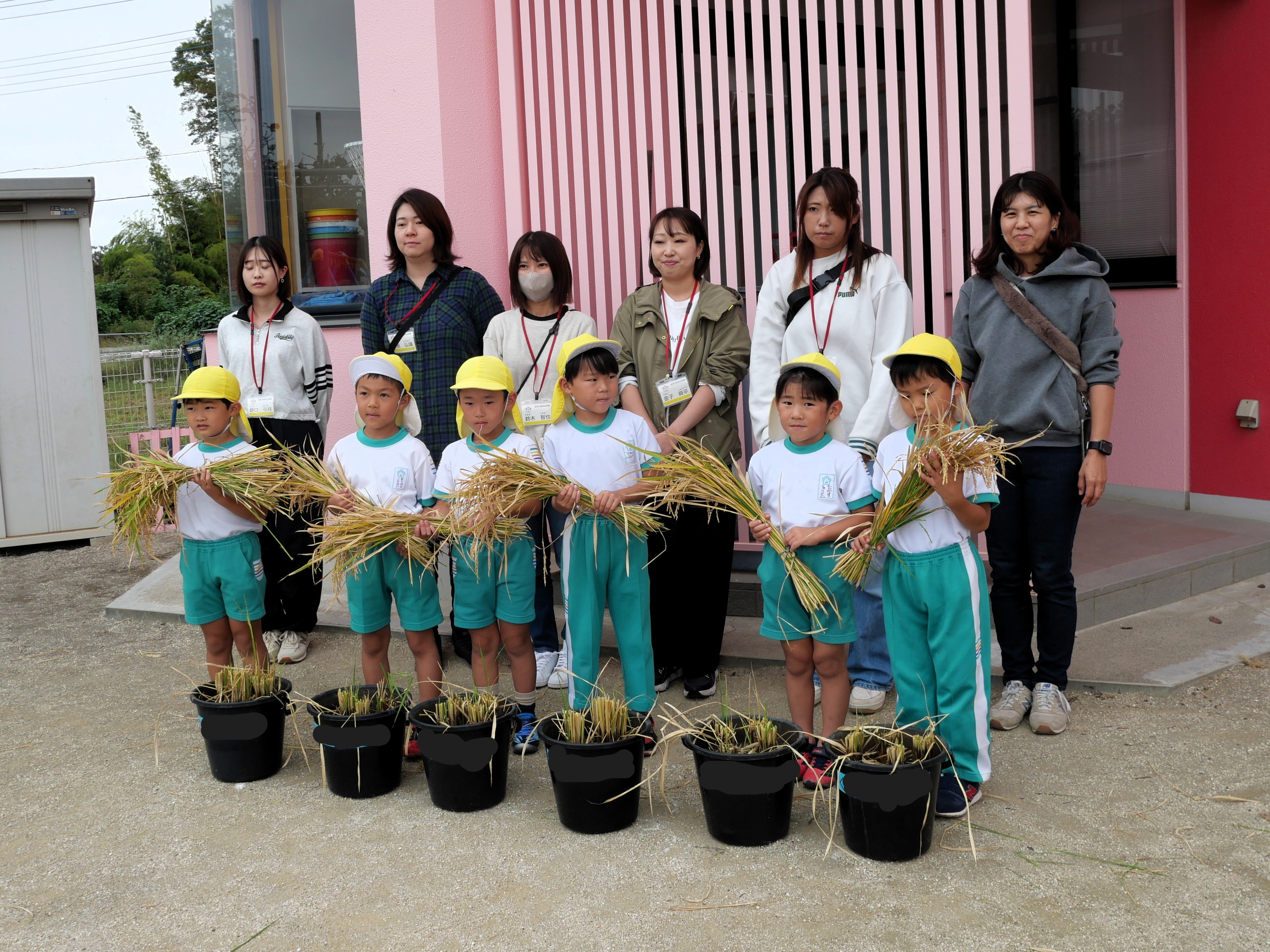 今日は年長さんが親子で稲刈りをしました。5月に親子で苗を植えて以来、一人ずつ自分の稲に水をあげながら育ててきた子どもたち。稲穂の中にしっかりとお米ができていることを実感しながら、慎重に稲を刈っていました。この後、脱穀、籾すり、精米を体験して、全園児おにぎりパーティーで収穫の喜びを分かち合います。年長さん、今までのお世話、お疲れ様でした。おにぎりパーティーまでもう少し!よろしくお願いしますね!