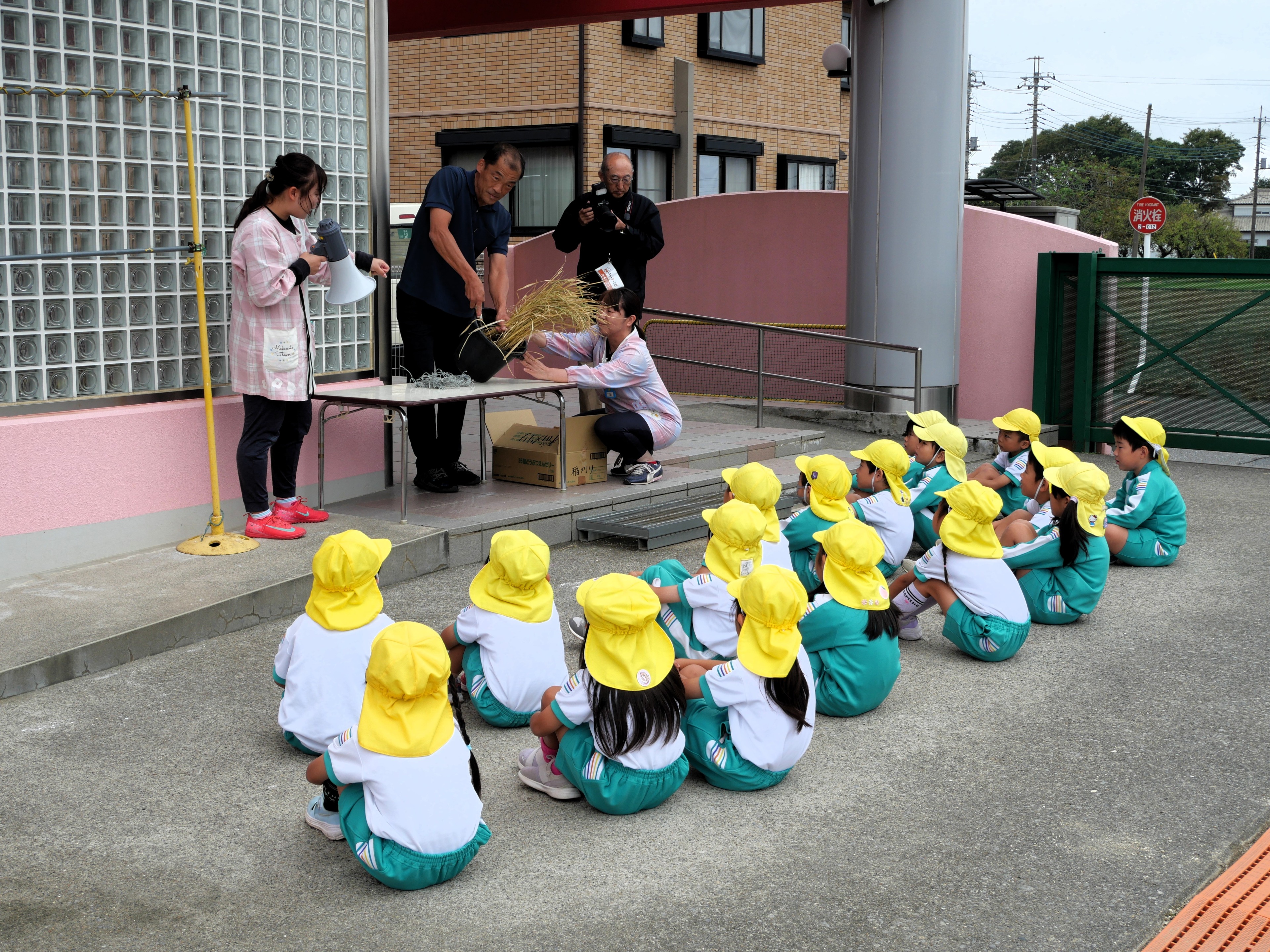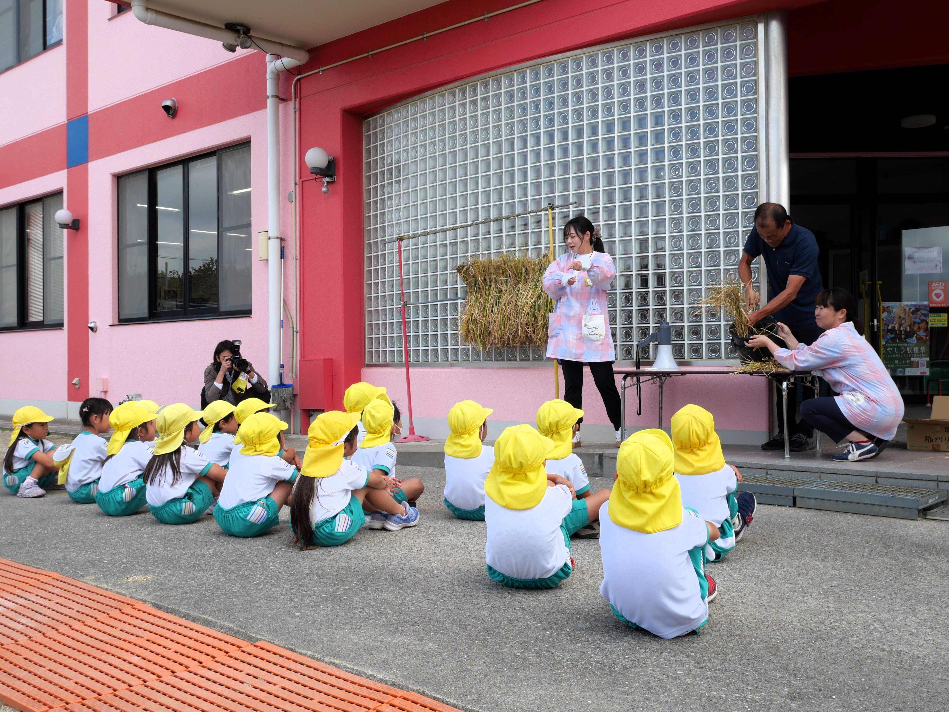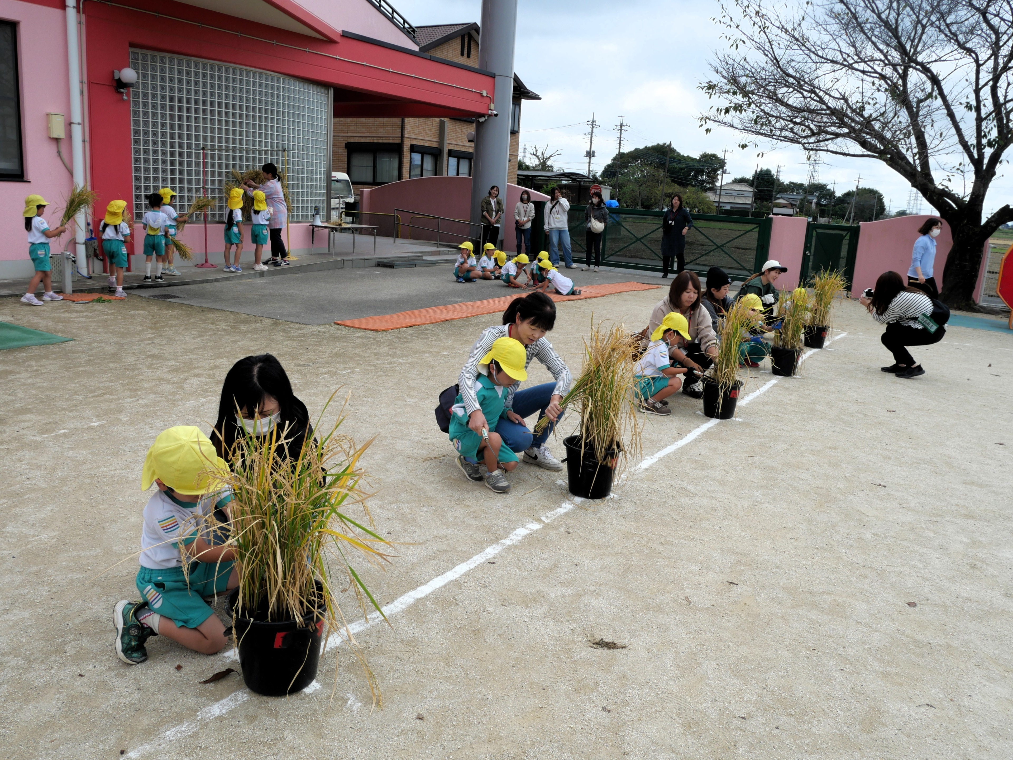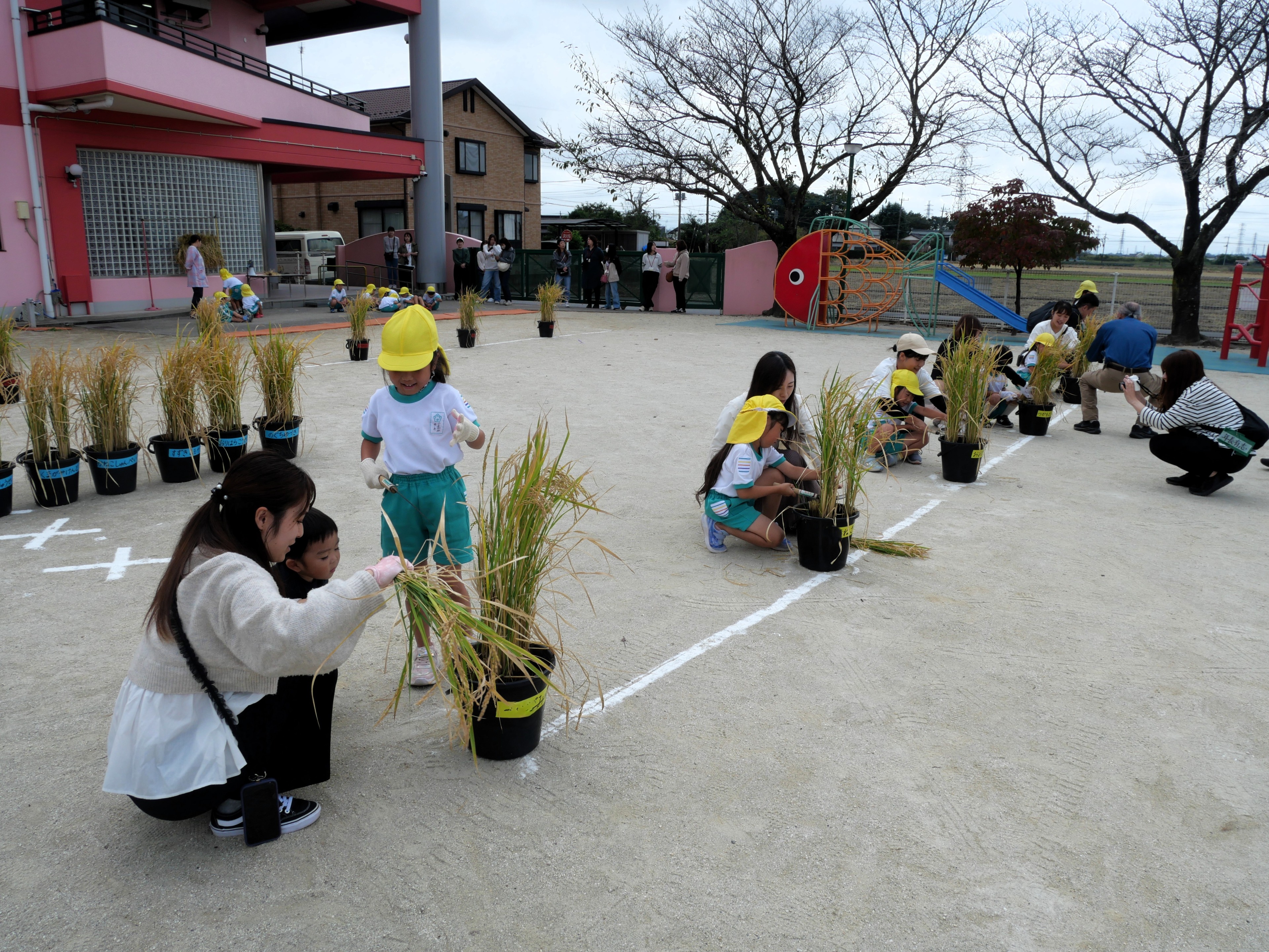 今日は年長さんが親子で稲刈りをしました。5月に親子で苗を植えて以来、一人ずつ自分の稲に水をあげながら育ててきた子どもたち。稲穂の中にしっかりとお米ができていることを実感しながら、慎重に稲を刈っていました。この後、脱穀、籾すり、精米を体験して、全園児おにぎりパーティーで収穫の喜びを分かち合います。年長さん、今までのお世話、お疲れ様でした。おにぎりパーティーまでもう少し!よろしくお願いしますね!