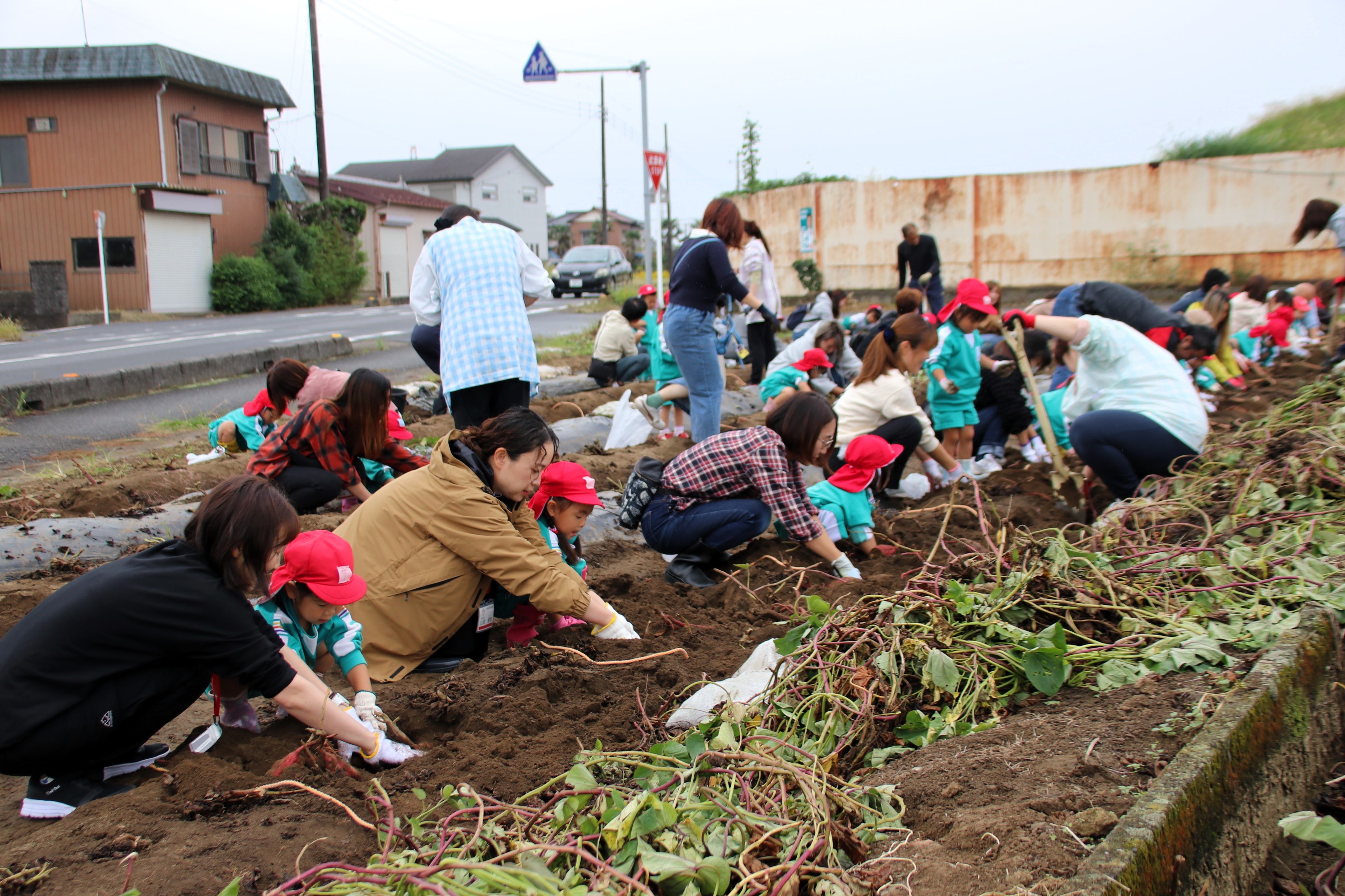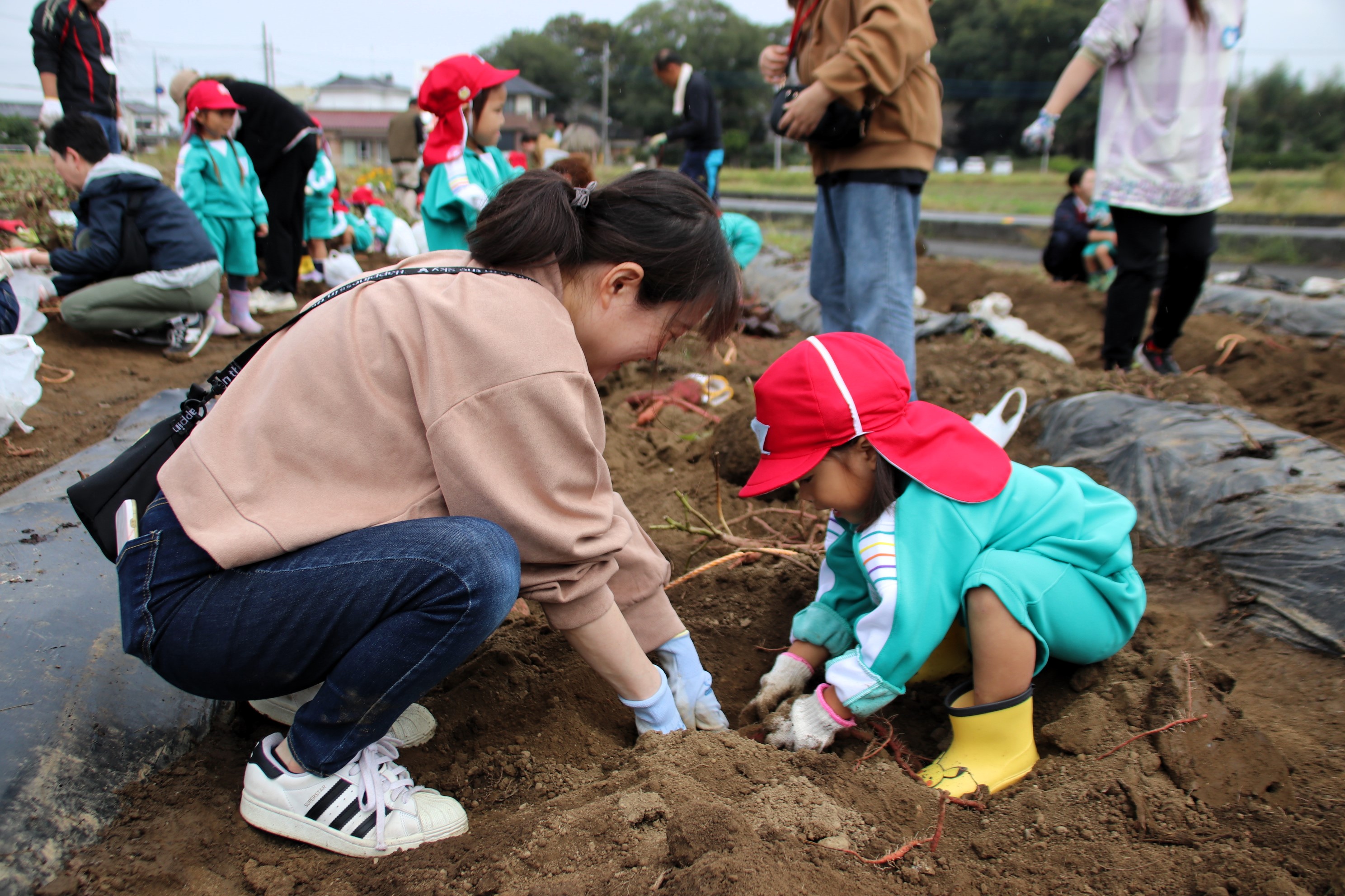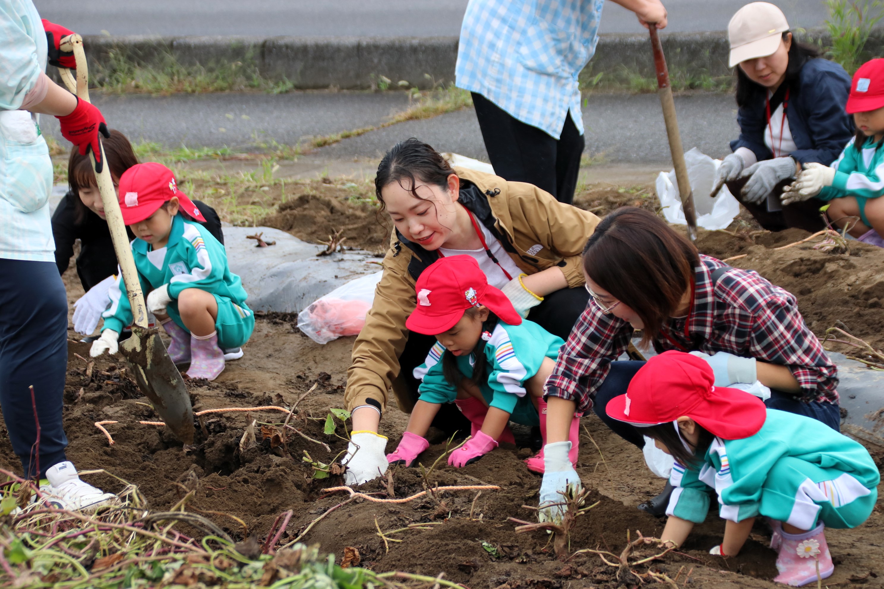 今日は年少さんが、親子でおいも掘りをしました。5月に親子で植えた苗は小さくて頼りない苗でしたが、日の光を浴び大地の養分を吸収して、大きくて立派なおいもに育ってくれました。思えば、ちゅうりっぷさんもこの半年でずいぶんと成長しましたね。笑顔いっぱいの楽しいおいも掘りになりました!