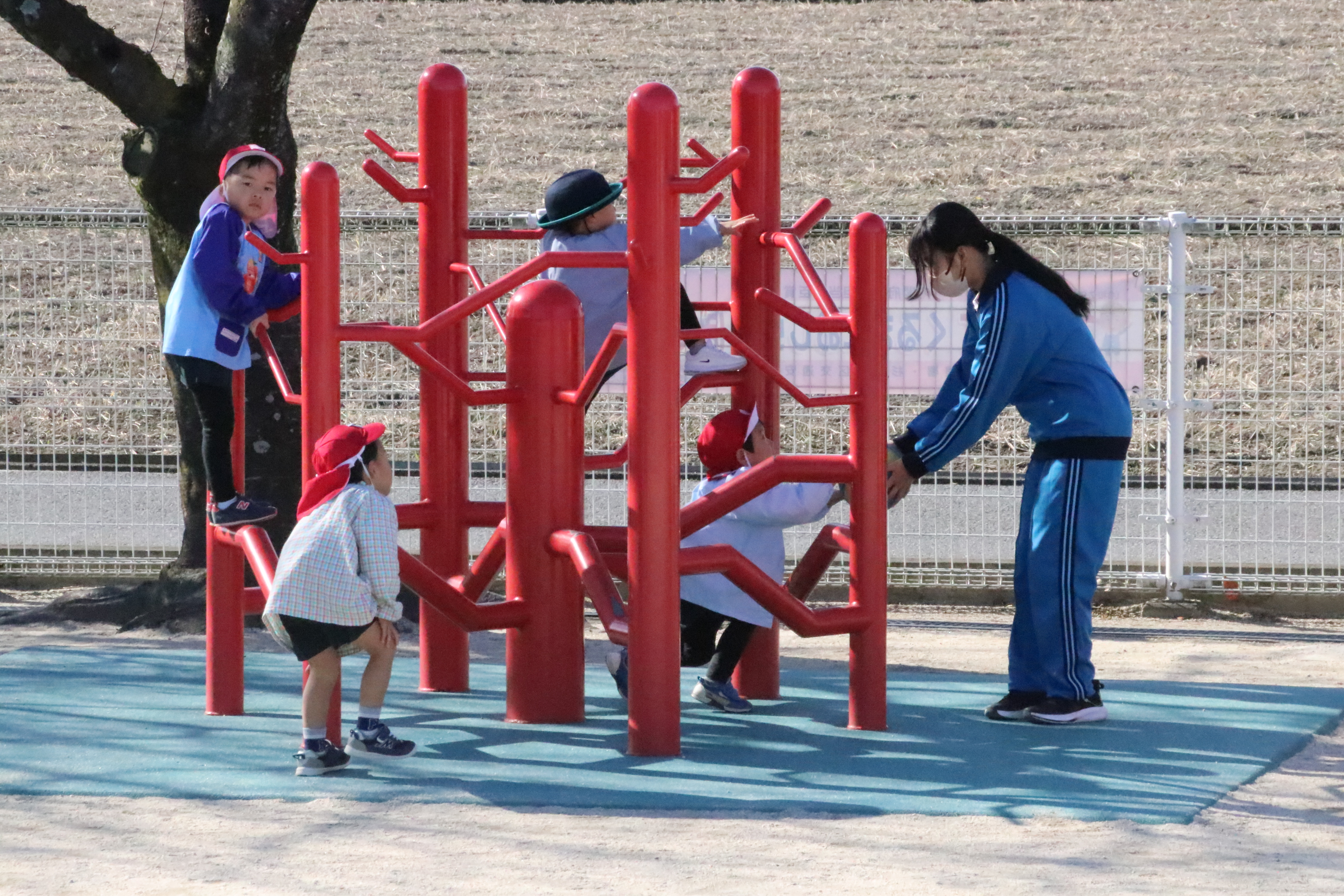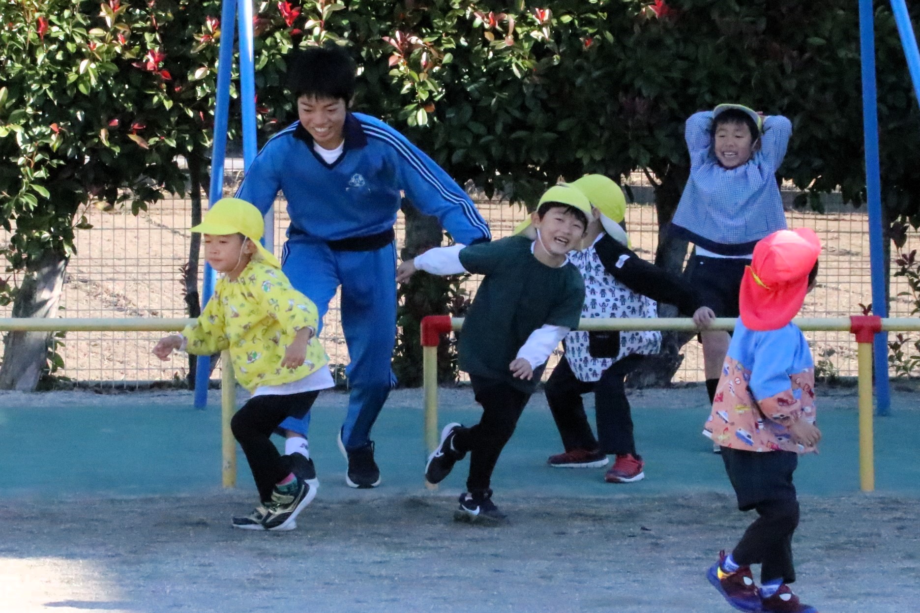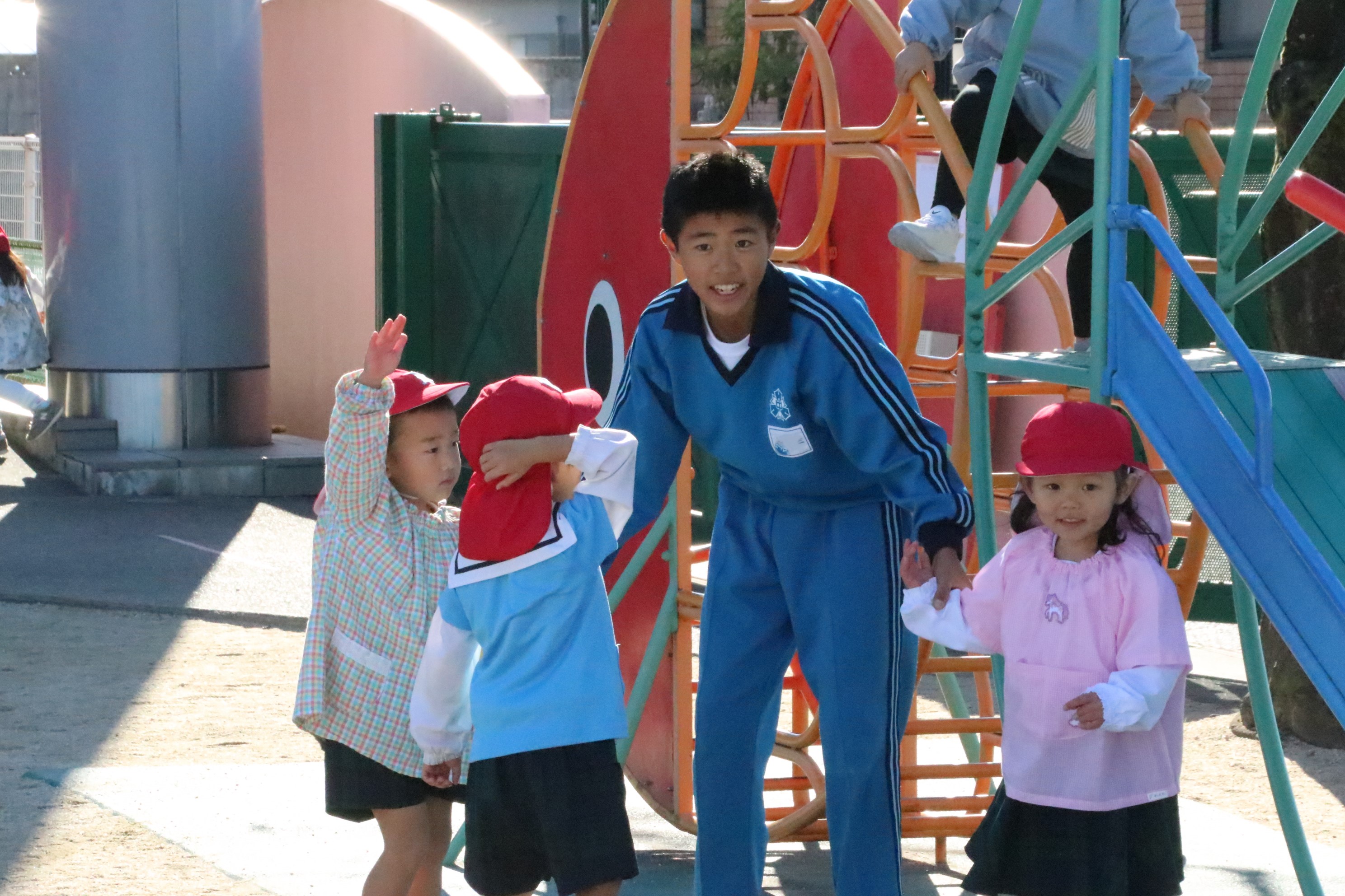 昨日、今日の2日間、宮代町の百間中学校2年生の生徒さん5人が職場体験学習に来てくれました。朝の外遊びに中学生が入ると、園児たちは大喜び!あっという間に群がって、鬼ごっこをしたり、遊具で遊んだりとすぐに打ち解けていました。お部屋では中学生が保育の補助をしたり、園児たちに絵本の読み聞かせをしたりするなど、それぞれ幼児教育の現場を学んでいたようです。中学生のみなさん、お疲れ様でした!