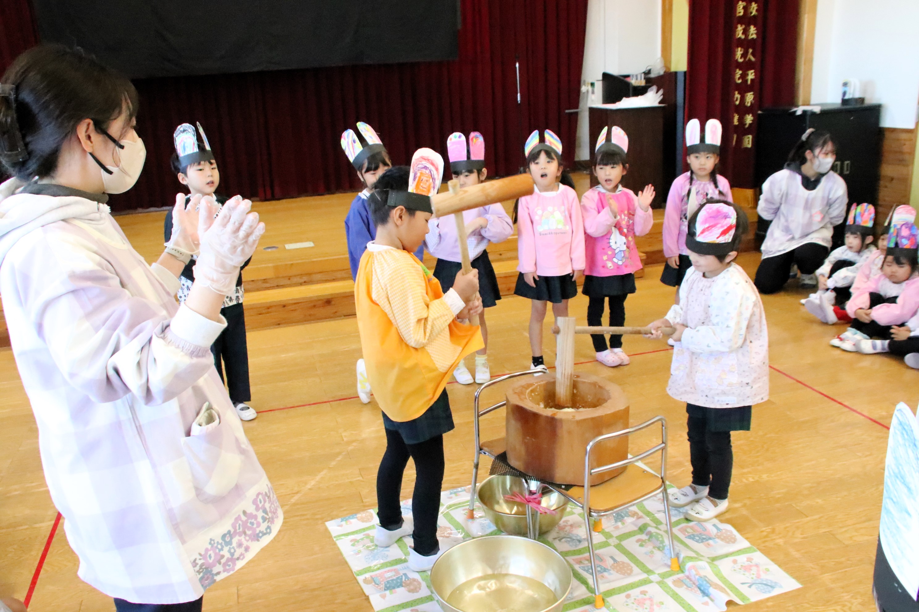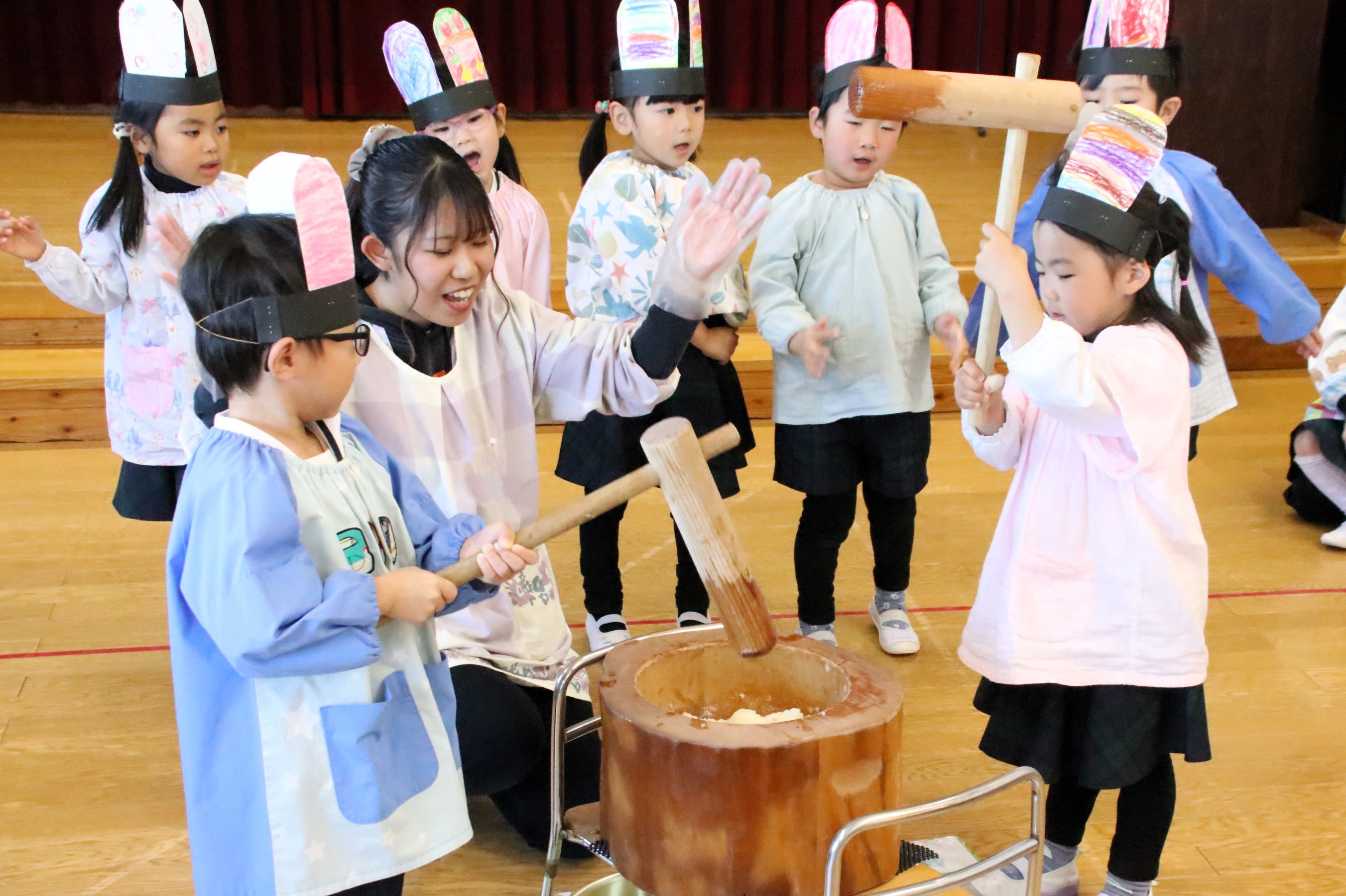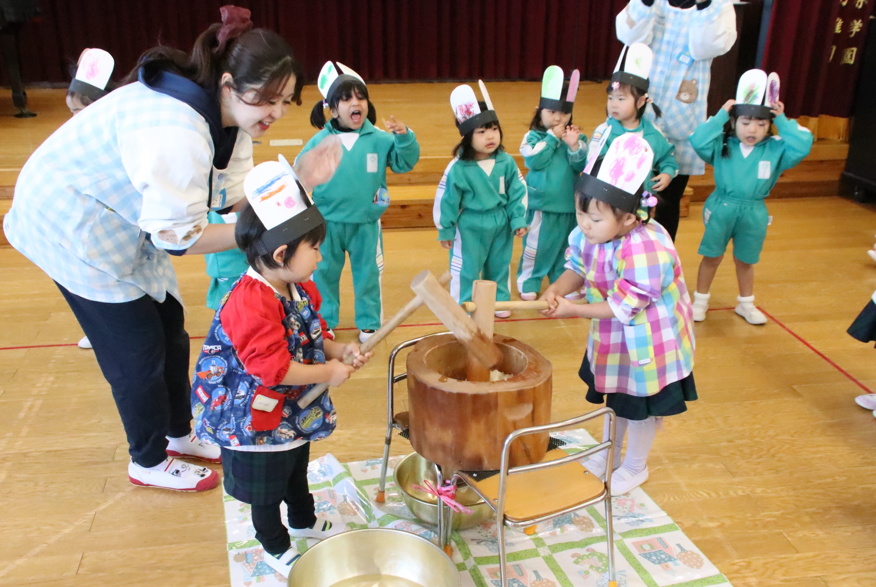 今日はおもちつき会。自分で色を塗ったうさぎのお耳をつけて参加しました。おもちつきの歌を歌ったり、紙芝居をみたりした後に、元気な掛け声を掛けながら全員がお餅をつきました。もち米がだんだんとお餅に変化していく様子に興味津々。ついたお餅は鏡餅にして各部屋に飾りました。おみやげに和菓子屋さんの大福を持ち帰り、ご満悦の子どもたちでした!