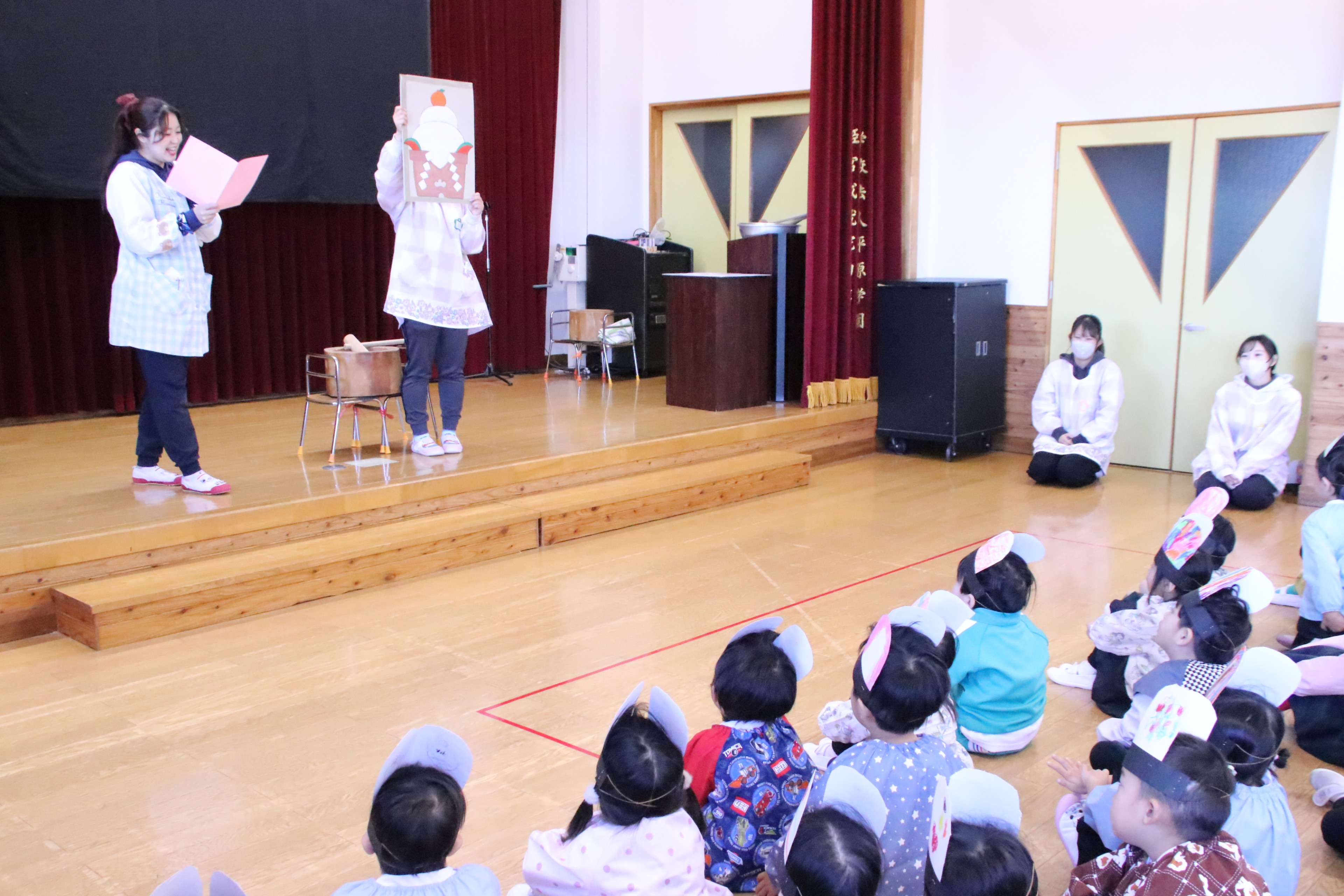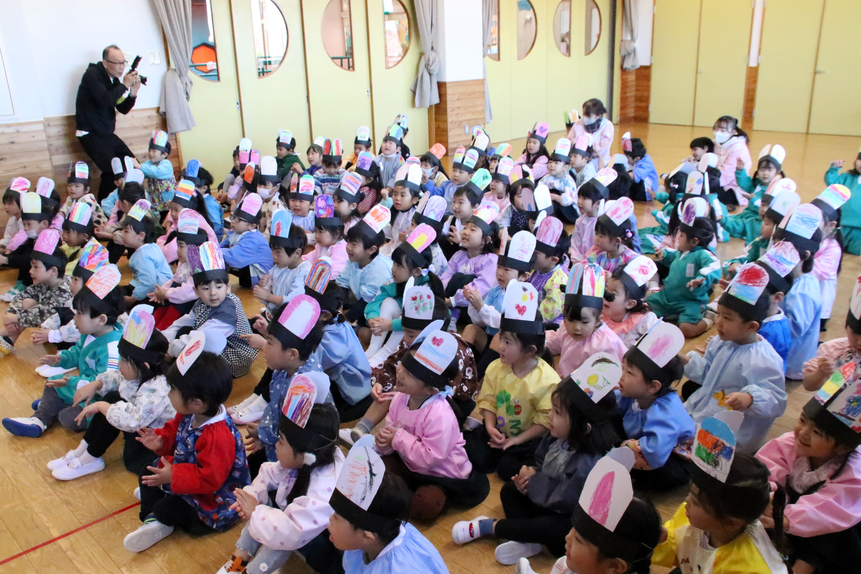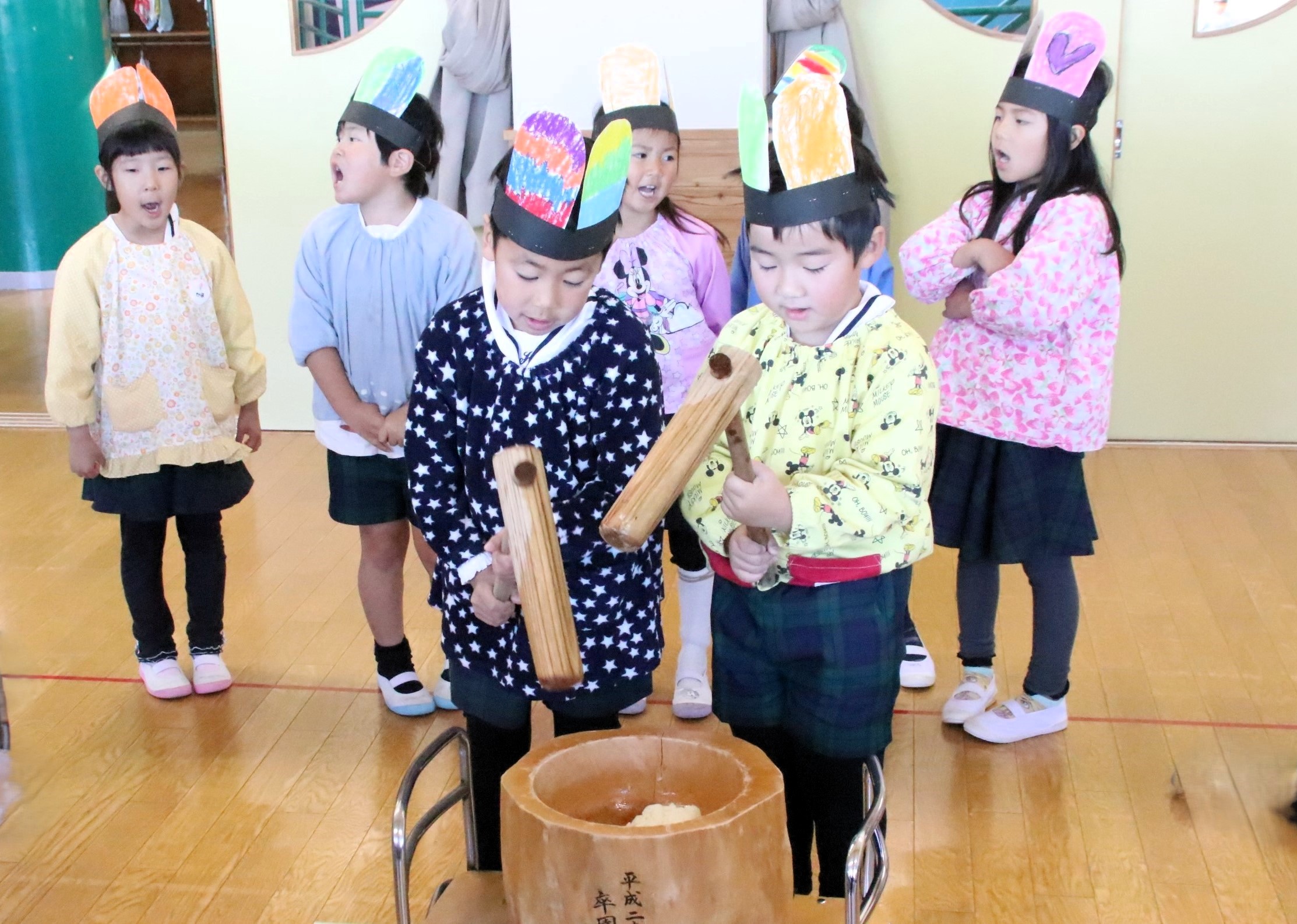 今日はおもちつき会。自分で色を塗ったうさぎのお耳をつけて参加しました。おもちつきの歌を歌ったり、紙芝居をみたりした後に、元気な掛け声を掛けながら全員がお餅をつきました。もち米がだんだんとお餅に変化していく様子に興味津々。ついたお餅は鏡餅にして各部屋に飾りました。おみやげに和菓子屋さんの大福を持ち帰り、ご満悦の子どもたちでした!