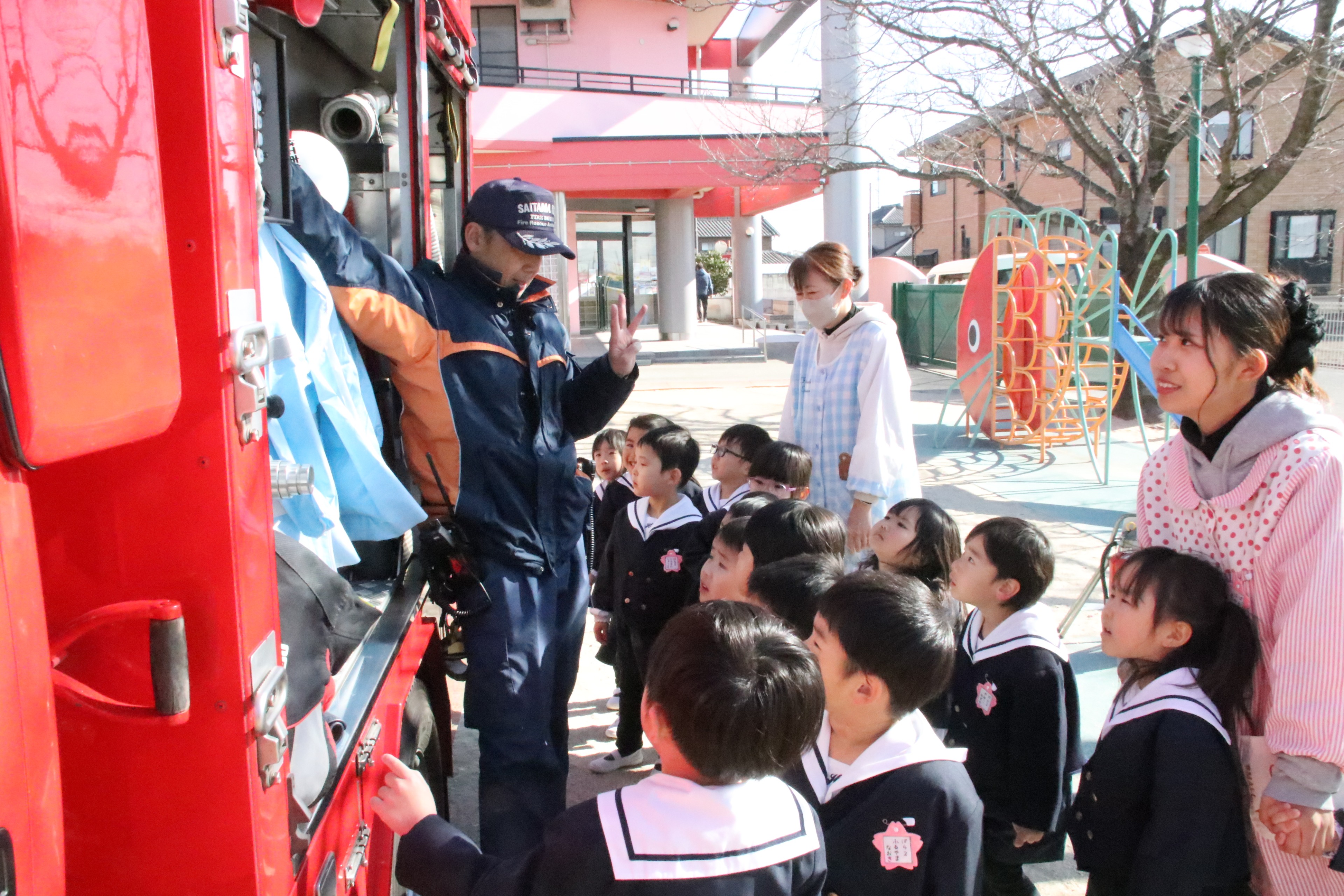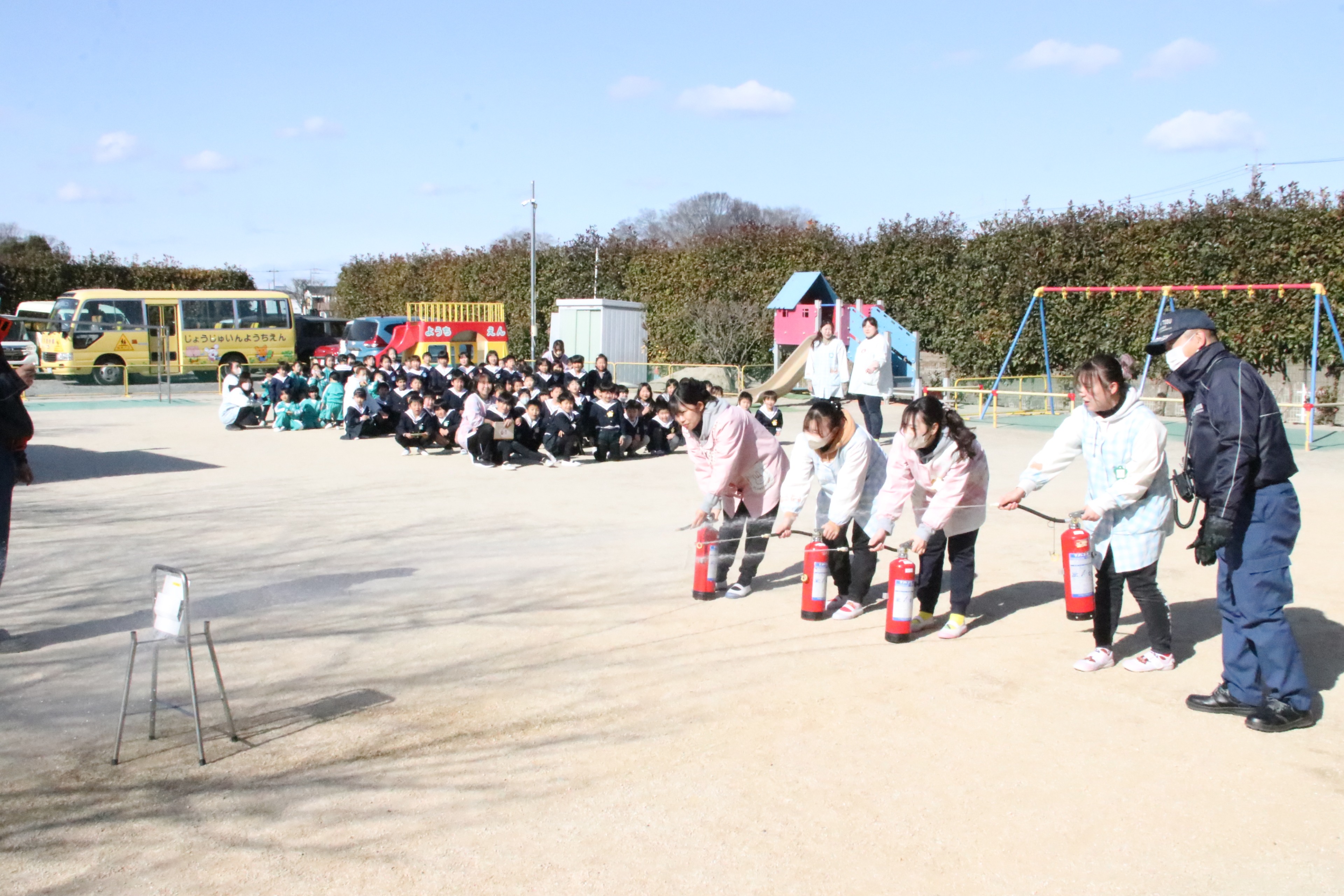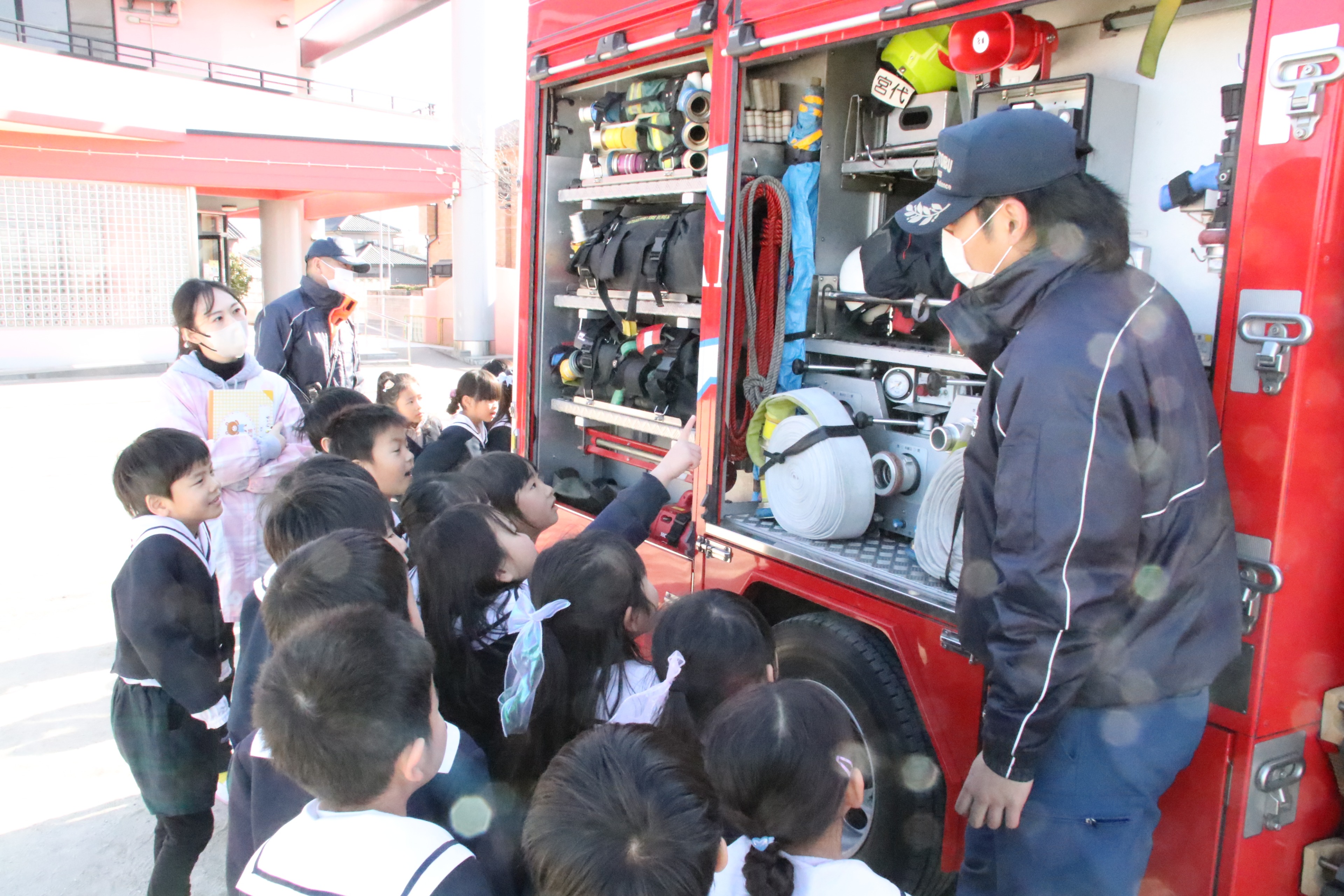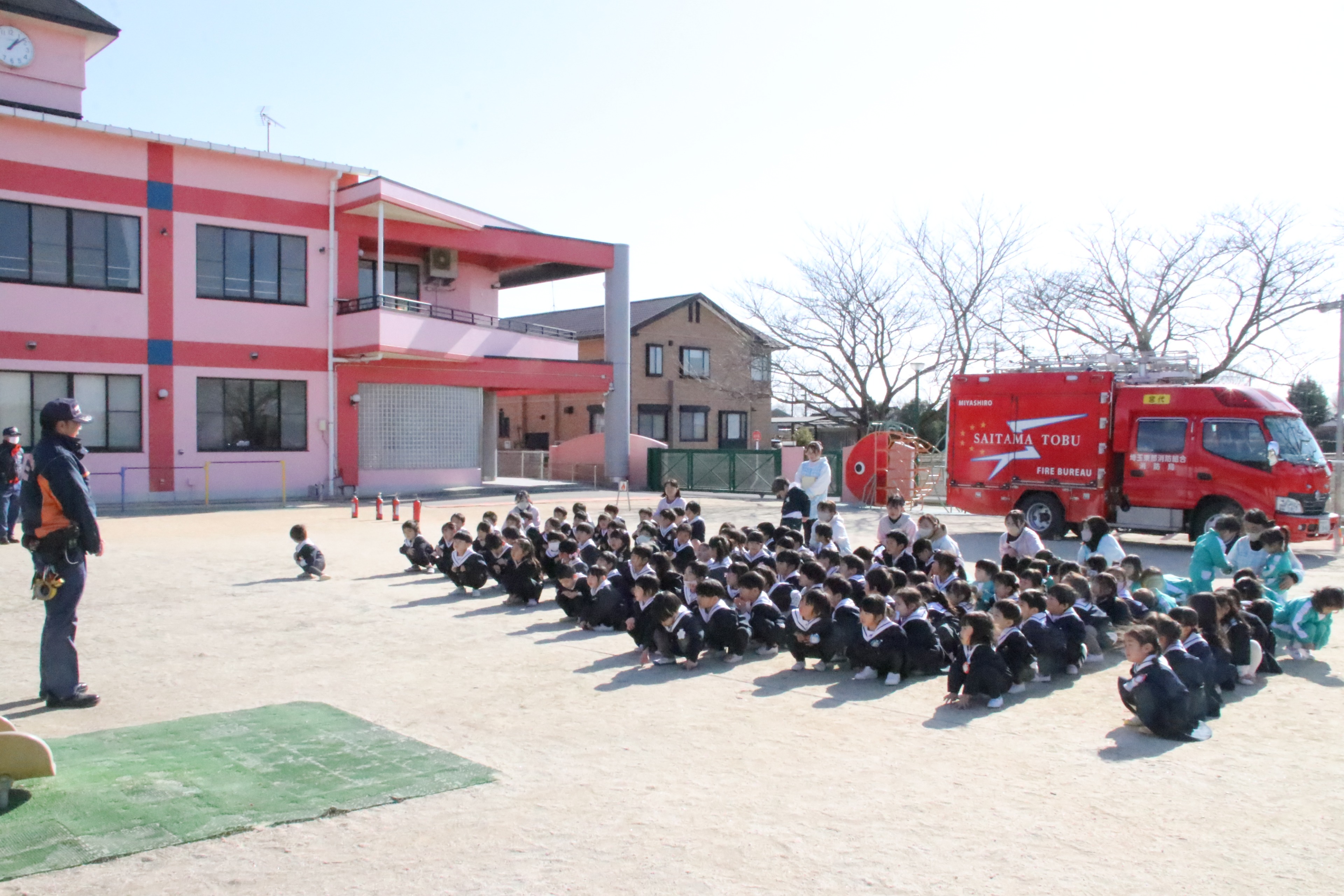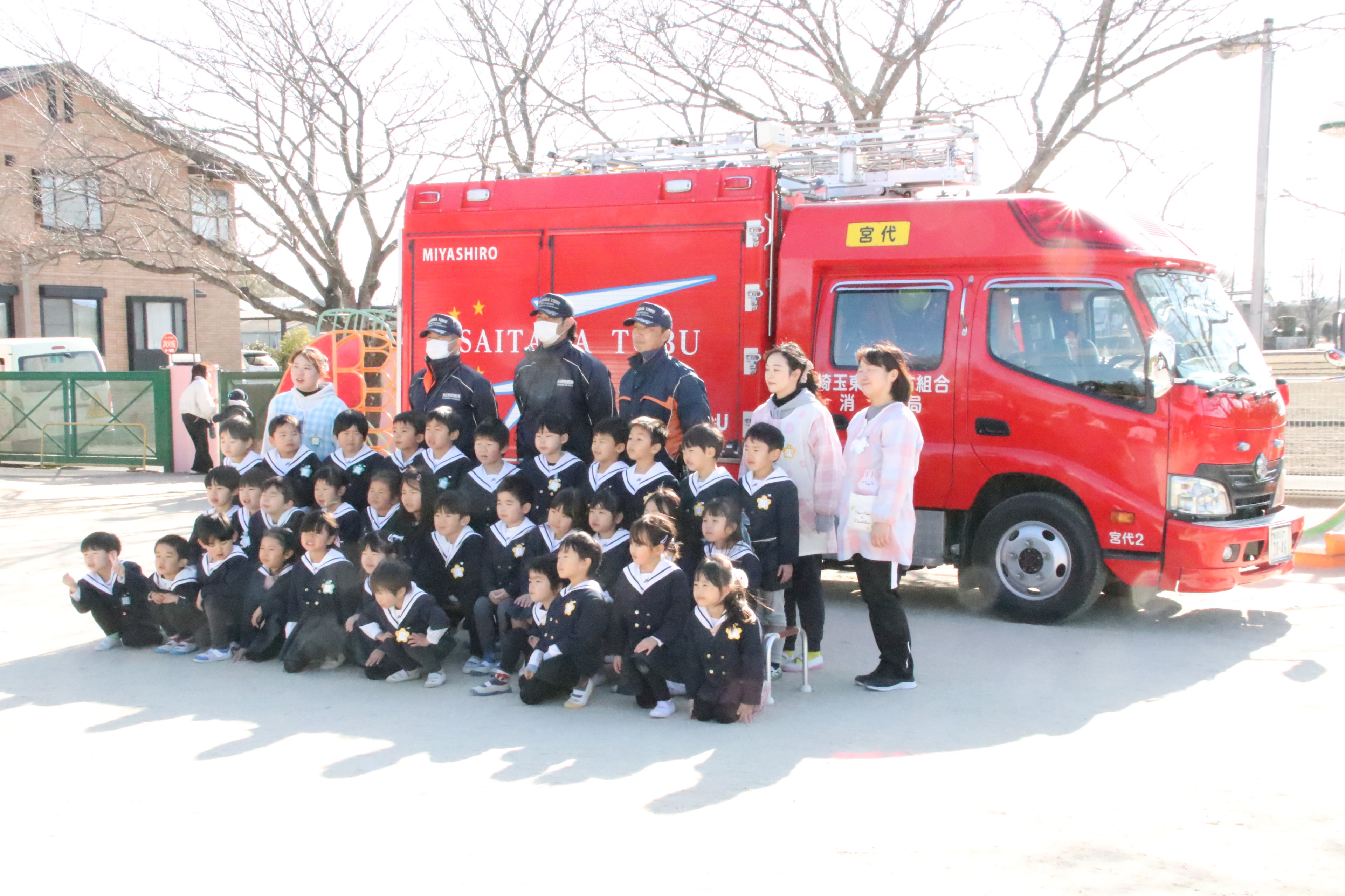 今日は宮代消防署の皆様の立ち合いの下、避難訓練を行いました。地震からの火災を想定した避難の様子を見ていただき、「100点満点です!」と、お褒めの言葉をいただきました。また、子どもたちの声援を受けながらの職員による消火訓練、最後には消防車も見せていただき子どもたちは大喜び。矢継ぎ早の質問にも丁寧にお答えいただきました。宮代消防署の皆様、ありがとうございました!
