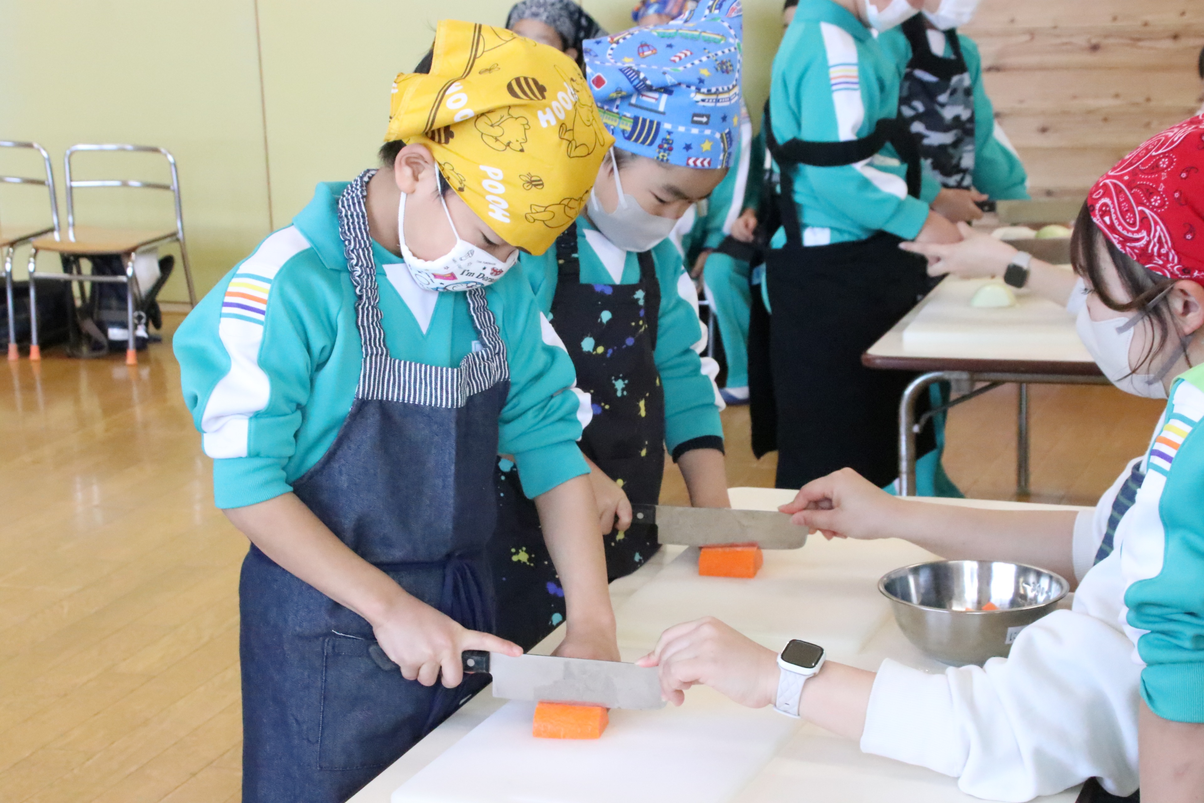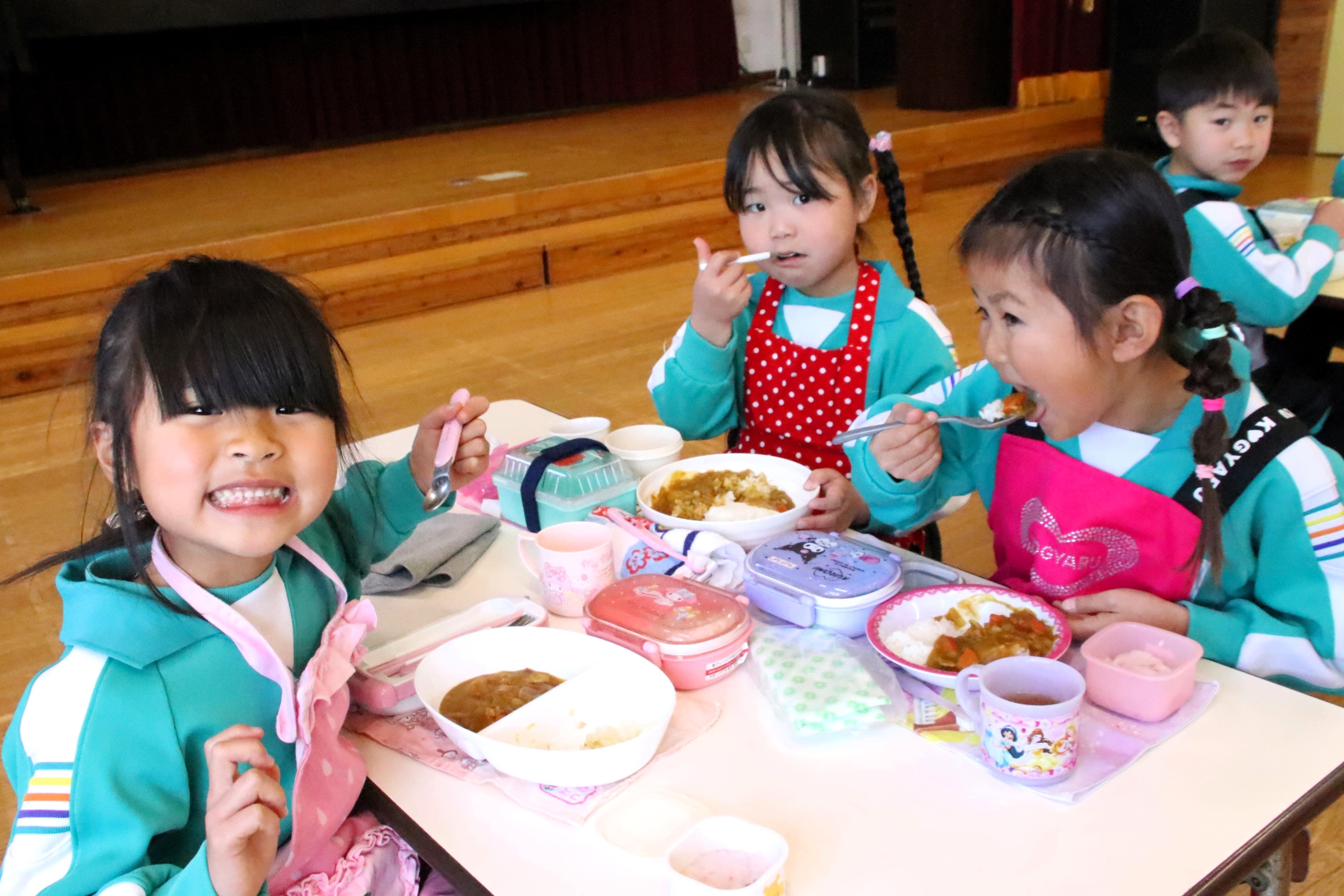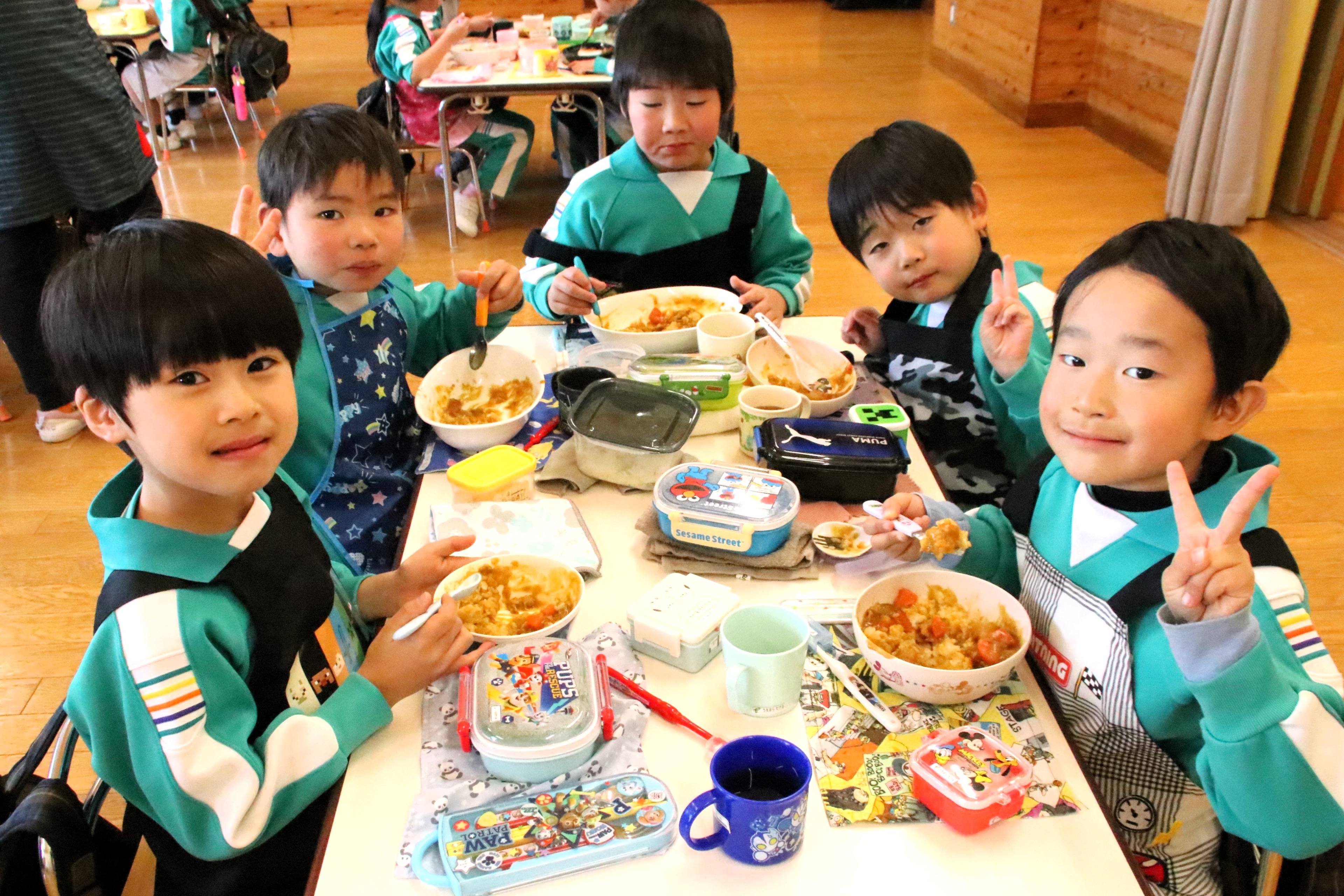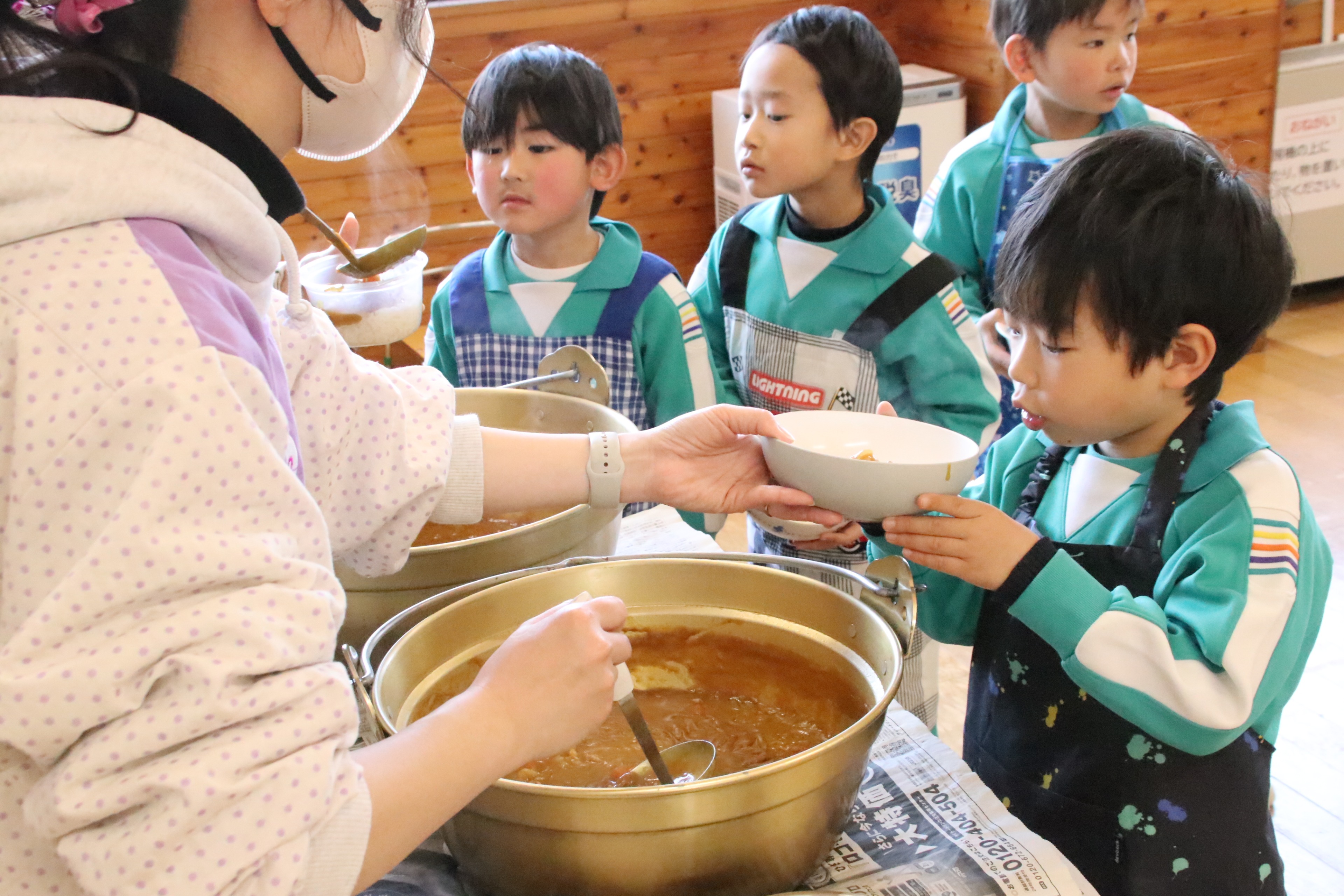 今日は年長さんがカレー作りに挑戦しました。包丁の持ち方、野菜の切り方を教わり、ジャガイモ・玉ねぎ・にんじんを切りました。その後、煮込んだ具材にルーを入れて、いよいよ試食。自分たちで作ったカレーを食べると「おいしい!!」と歓声と笑顔があふれ、みんなモリモリ食べていました!お家でも作ってパパやママにごちそうしてくださいね!
