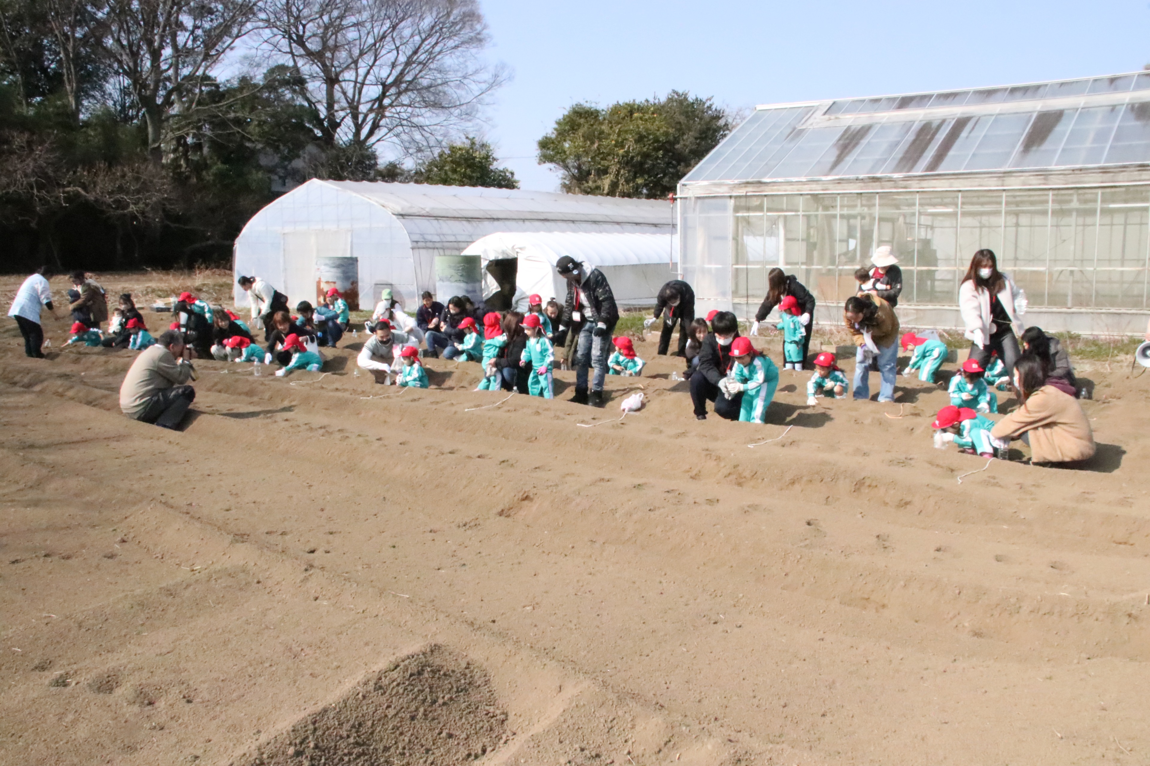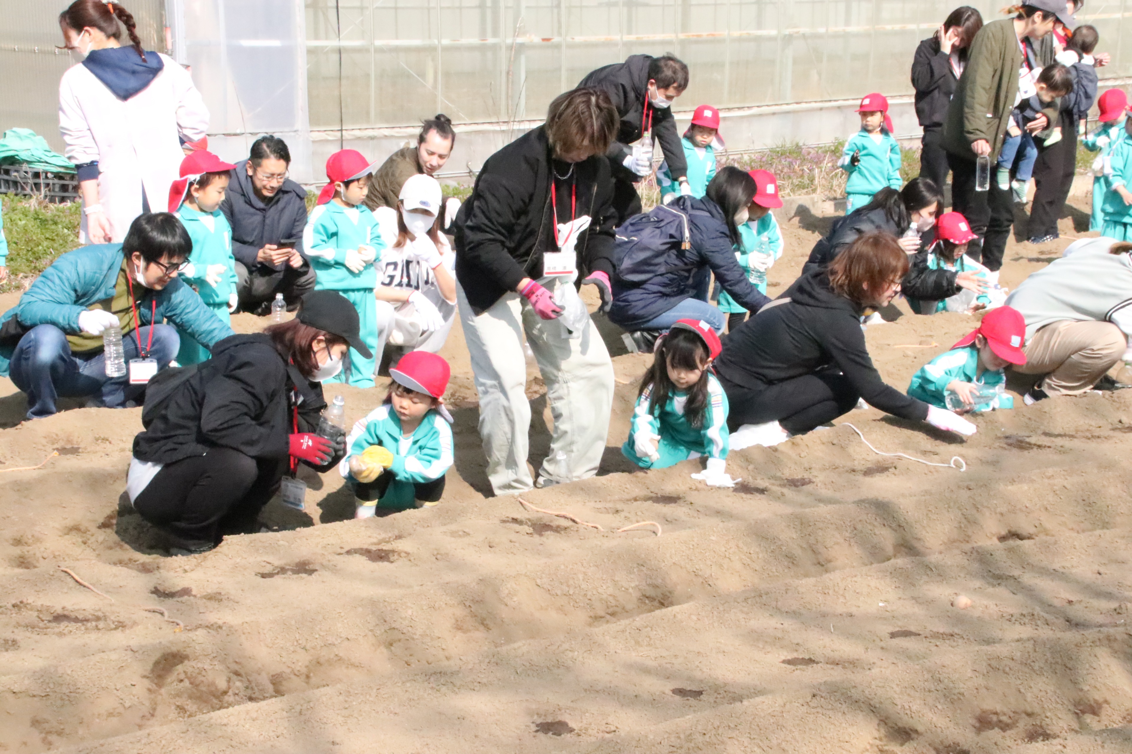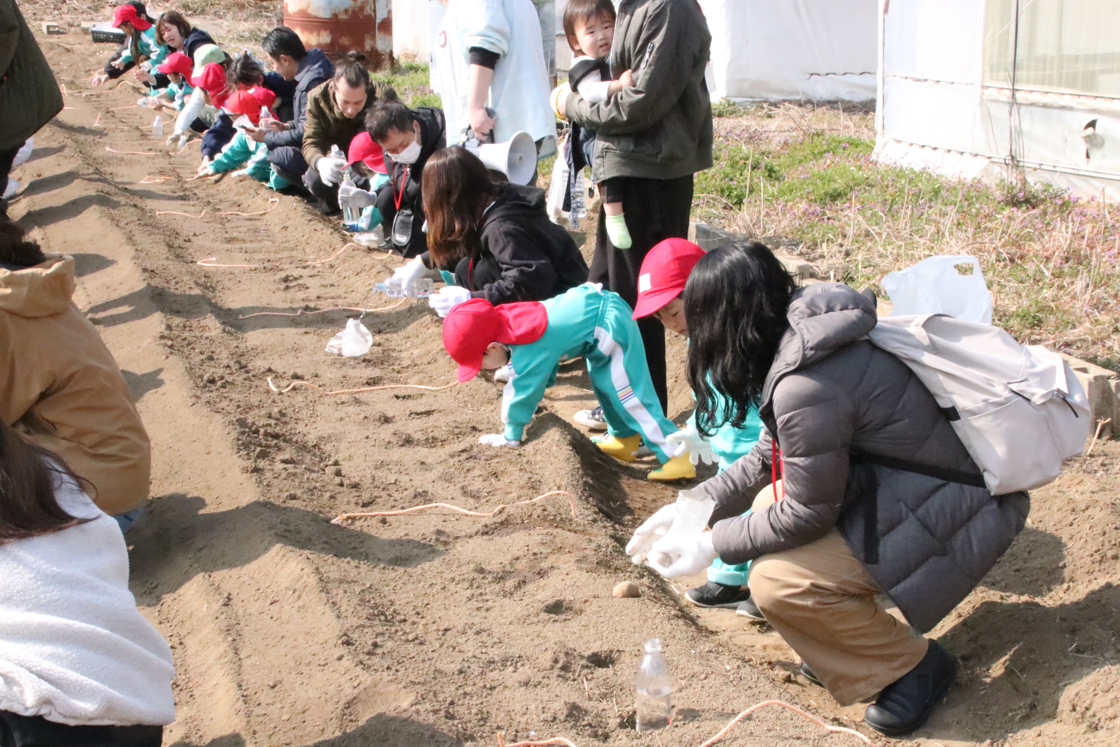 今日は年少さんが親子でジャガイモの種芋を植えました。早春の暖かな陽射しの下、土手を歩く皆さんの表情はとてもにこやかでで、畑でも楽しそうに過ごすことができました。5つずつ植え「大きくなあれ!」の呪文もかけたので、6月にはたくさんのジャガイモが採れることでしょう。その頃はみんな年中さん。楽しみですね!