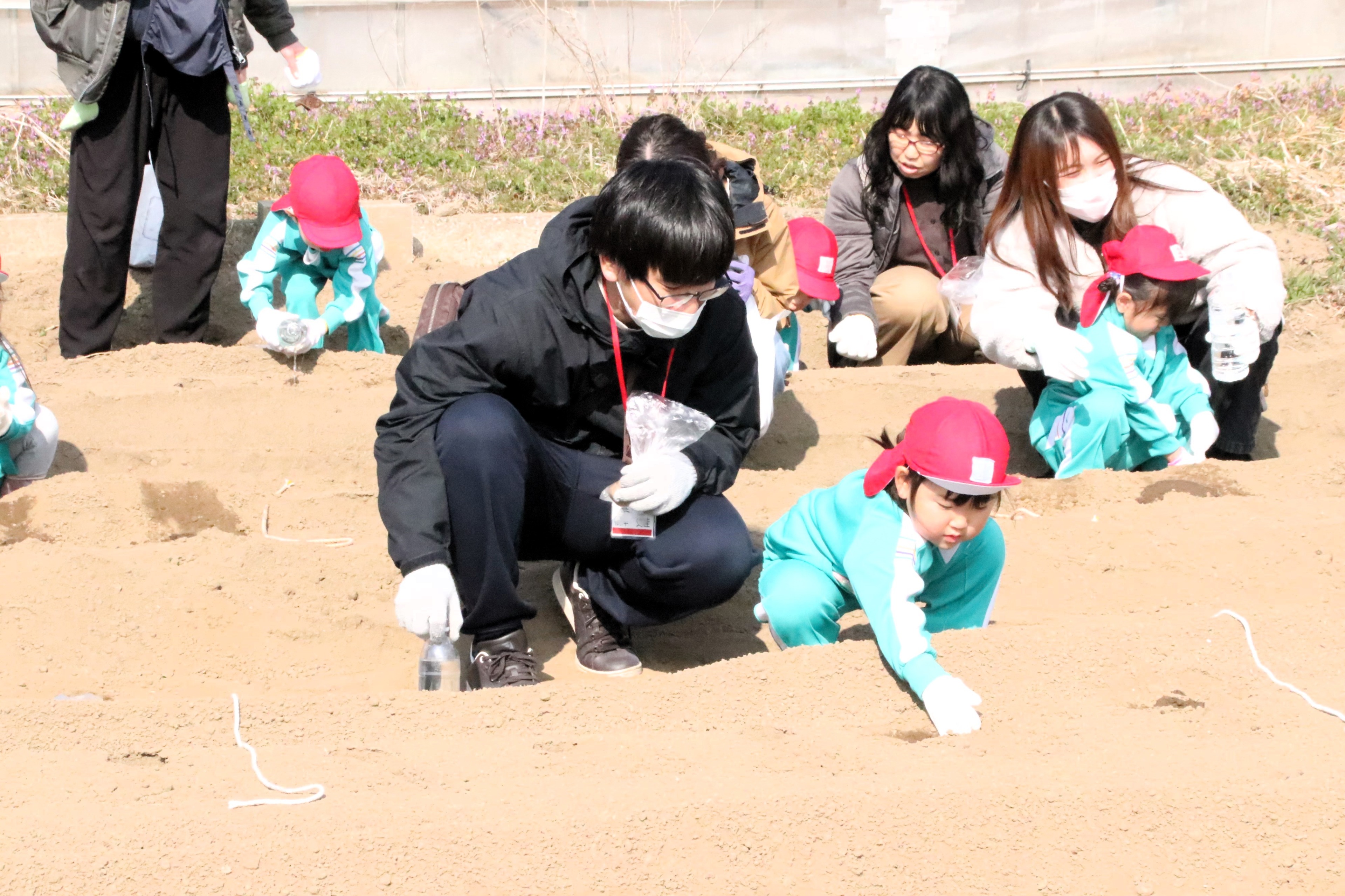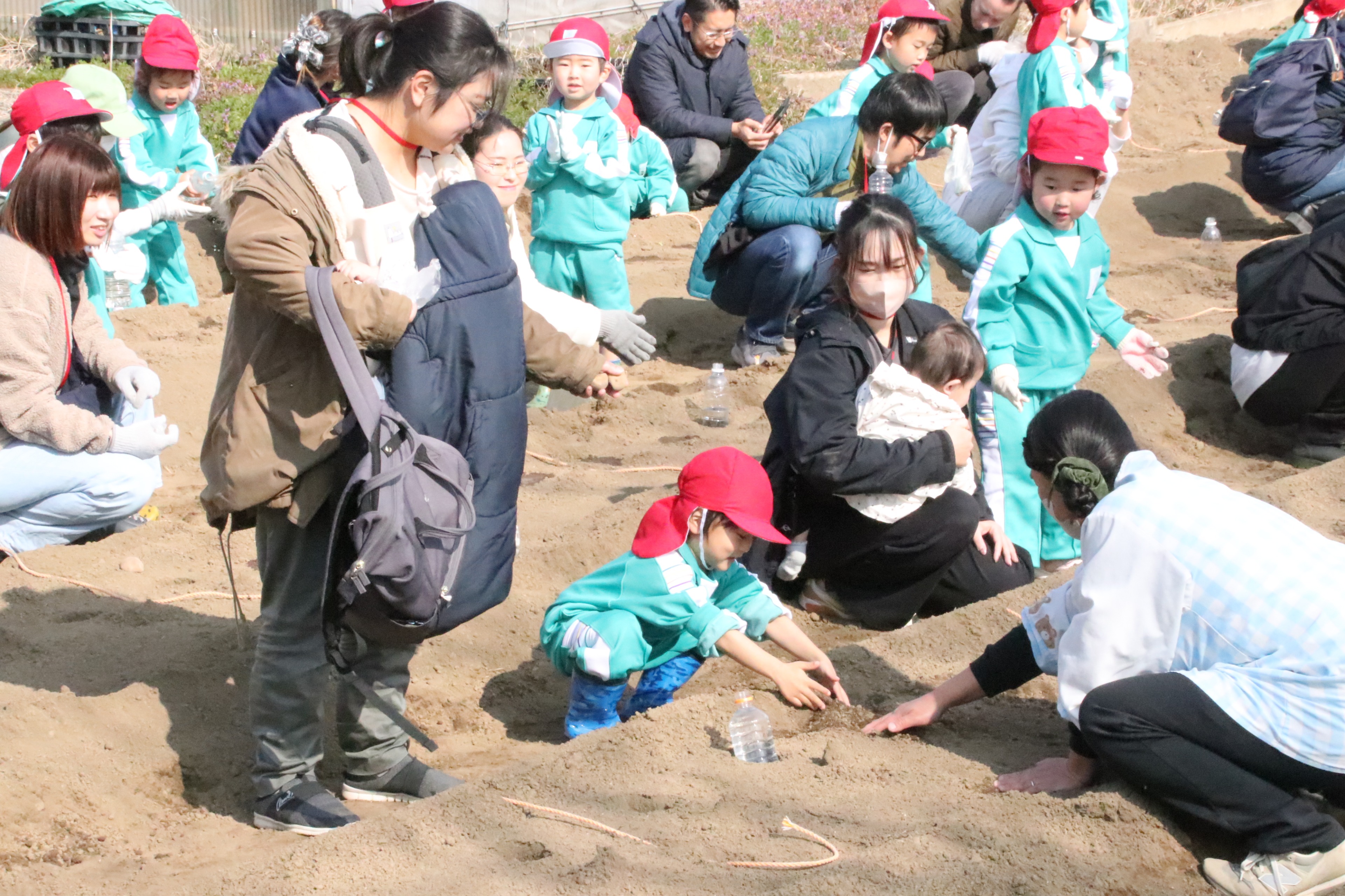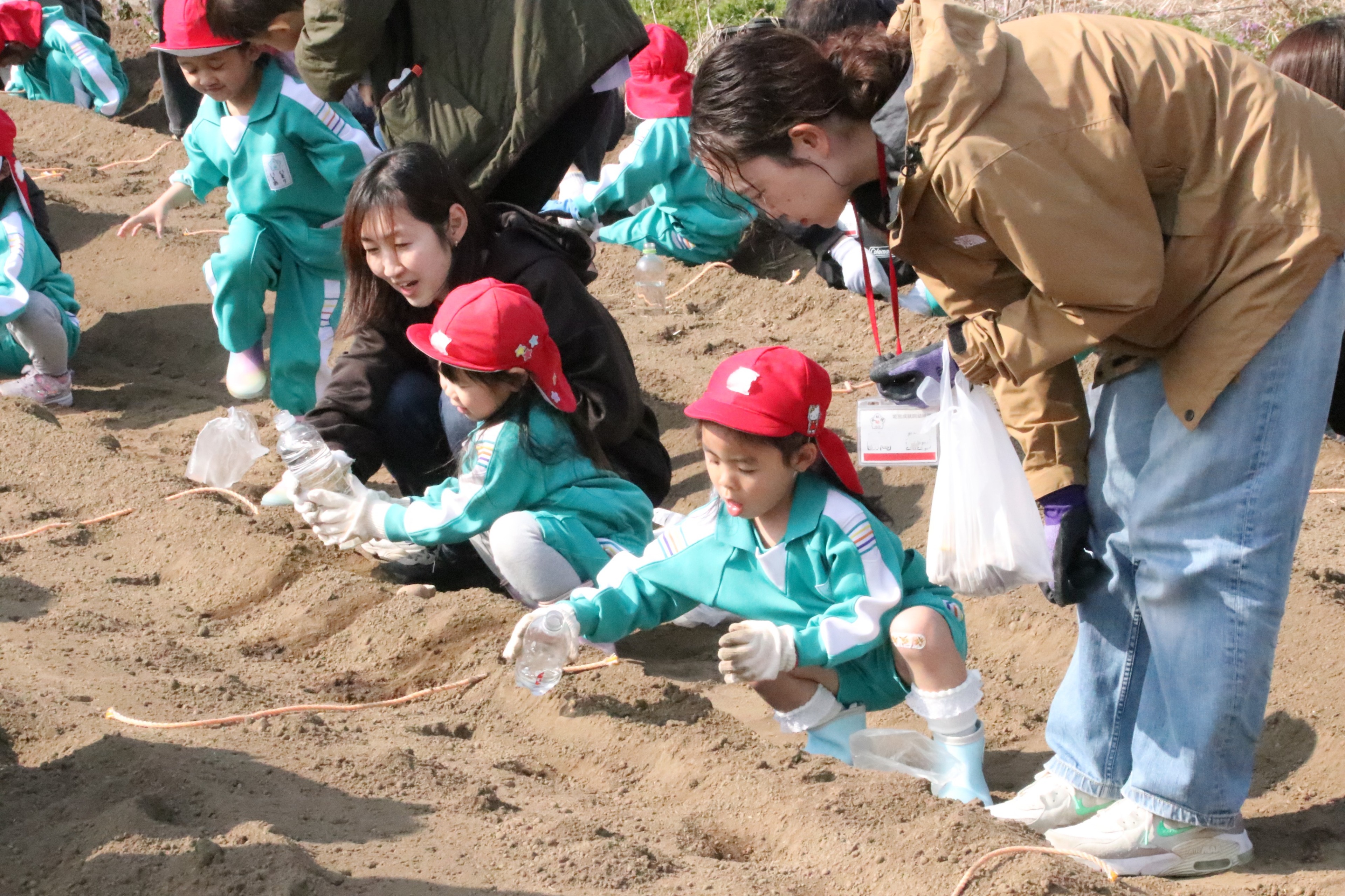 今日は年少さんが親子でジャガイモの種芋を植えました。早春の暖かな陽射しの下、土手を歩く皆さんの表情はとてもにこやかでで、畑でも楽しそうに過ごすことができました。5つずつ植え「大きくなあれ!」の呪文もかけたので、6月にはたくさんのジャガイモが採れることでしょう。その頃はみんな年中さん。楽しみですね!
